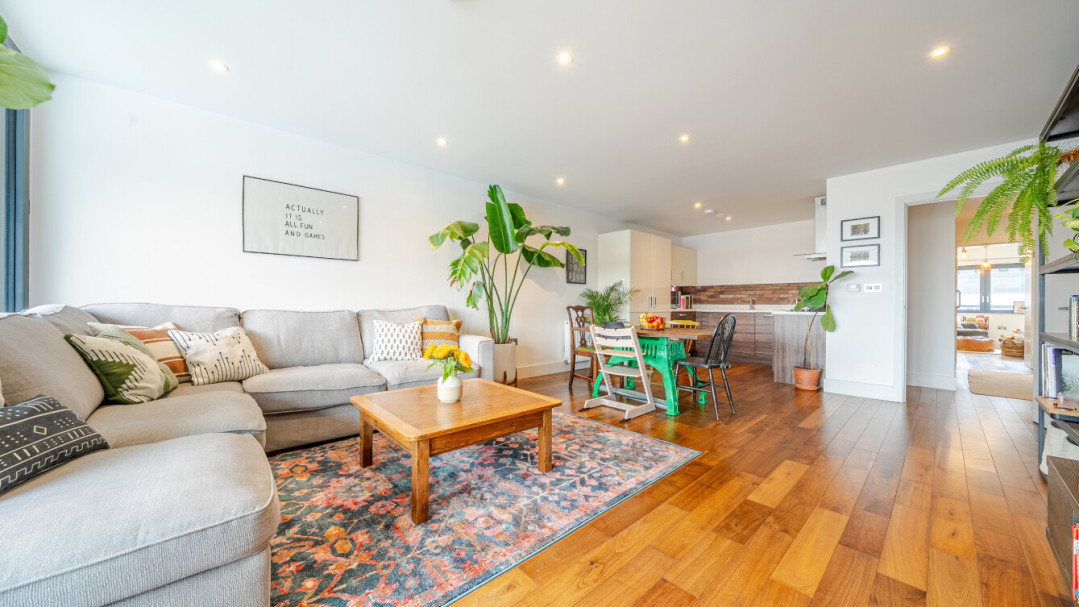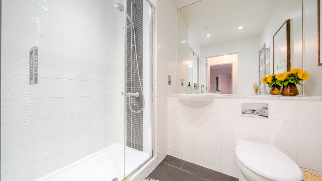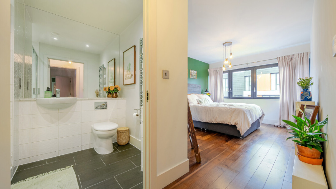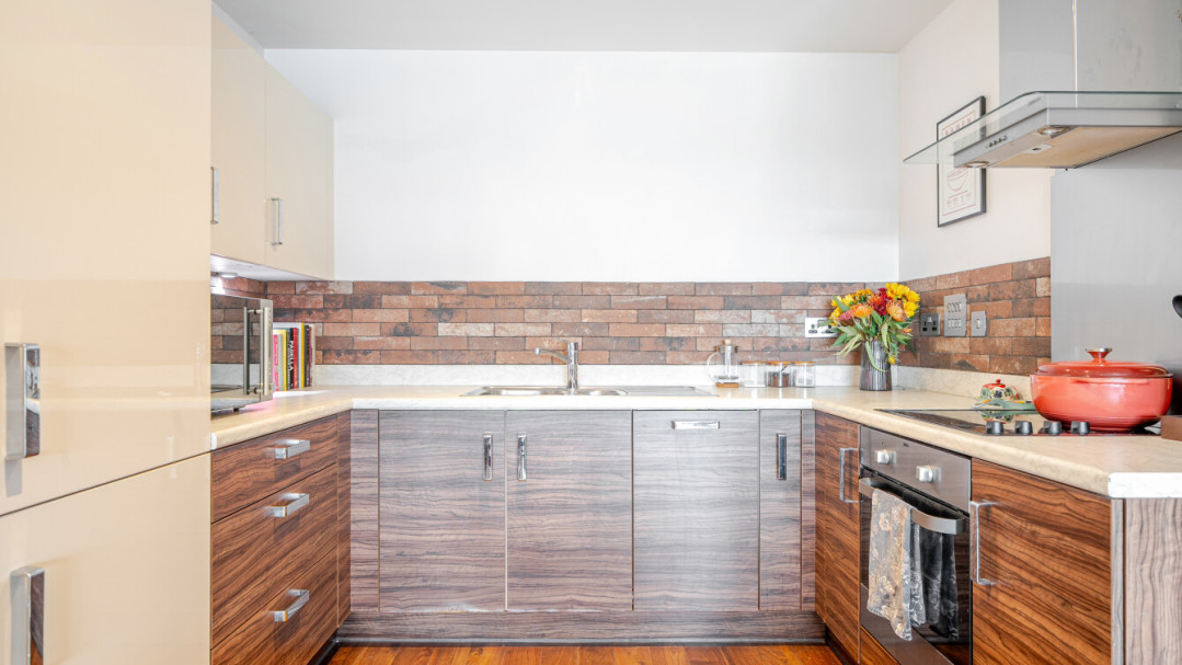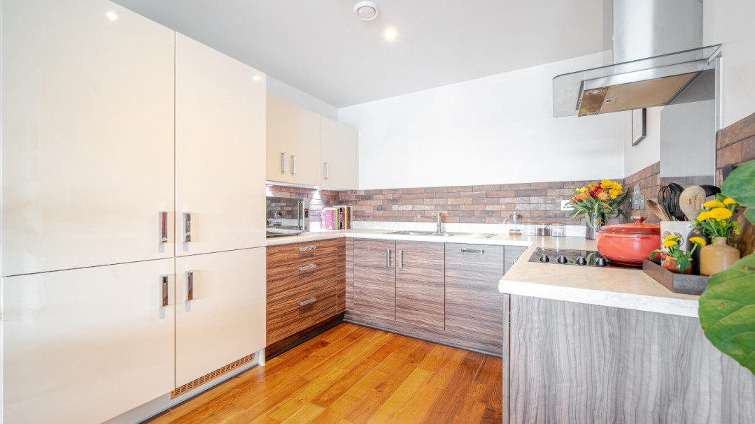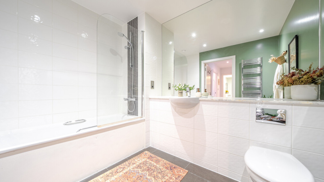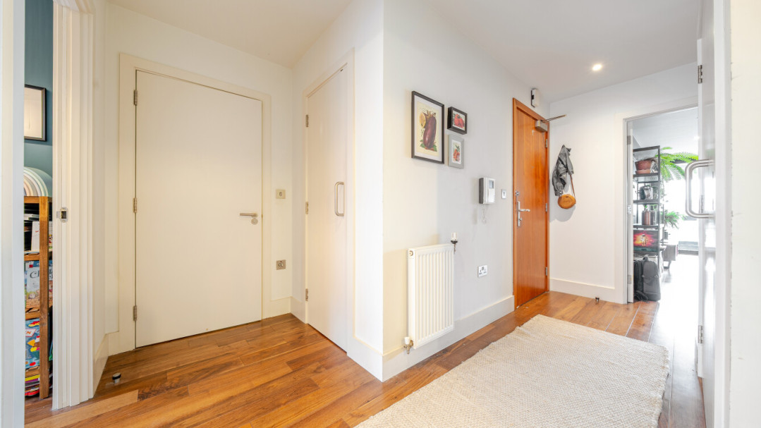 Enter this beautifully presented, stylish, dual aspect apartment via a spacious central hallway with storage. Find a contemporary family bathroom to your right, together with three double bedrooms, the master having benefit of a built in wardrobe and an ensuite shower room. The well proportioned living area is on the other side of the apartment, and leads to a private covered balcony, which overlooks the landscaped communal courtyard. The two tone modern kitchen incorporates fully integrated appliances including a brand new LG washing machine.