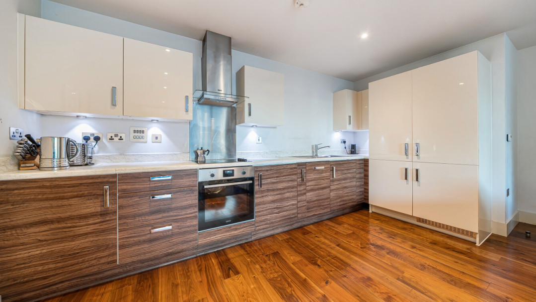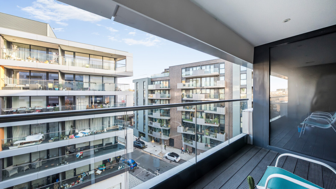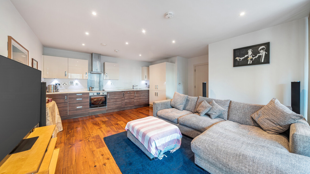 Enter this east facing apartment via a central hallway with storage. The well proportioned living area is to the right, and leads to a private balcony, with views of the the landscaped communal courtyard. The two tone modern kitchen incorporates fully integrated appliances. On the other side of the apartment, find the master bedroom, which has benefit of a mirrored wardrobe and en-suite shower room and space for a home office area. A second double bedroom, which overlooks the balcony, is served by a contemporary family bathroom.