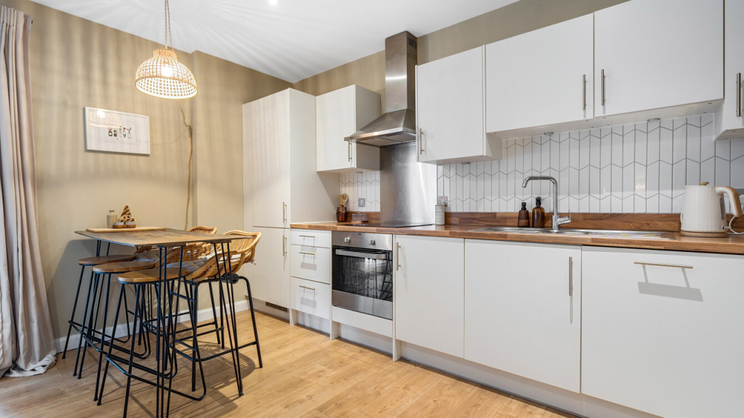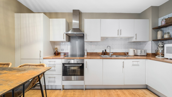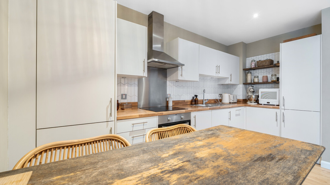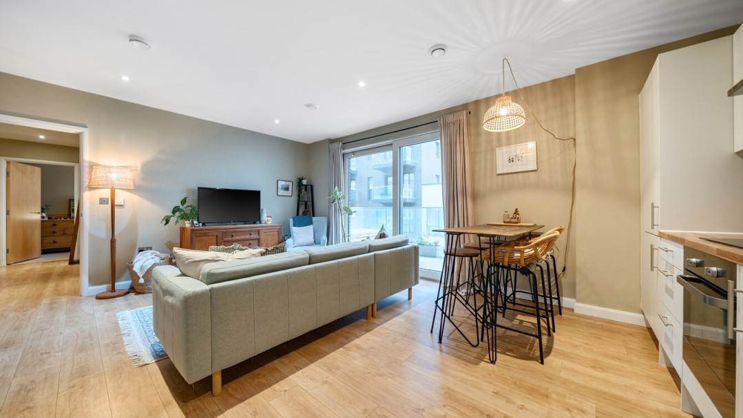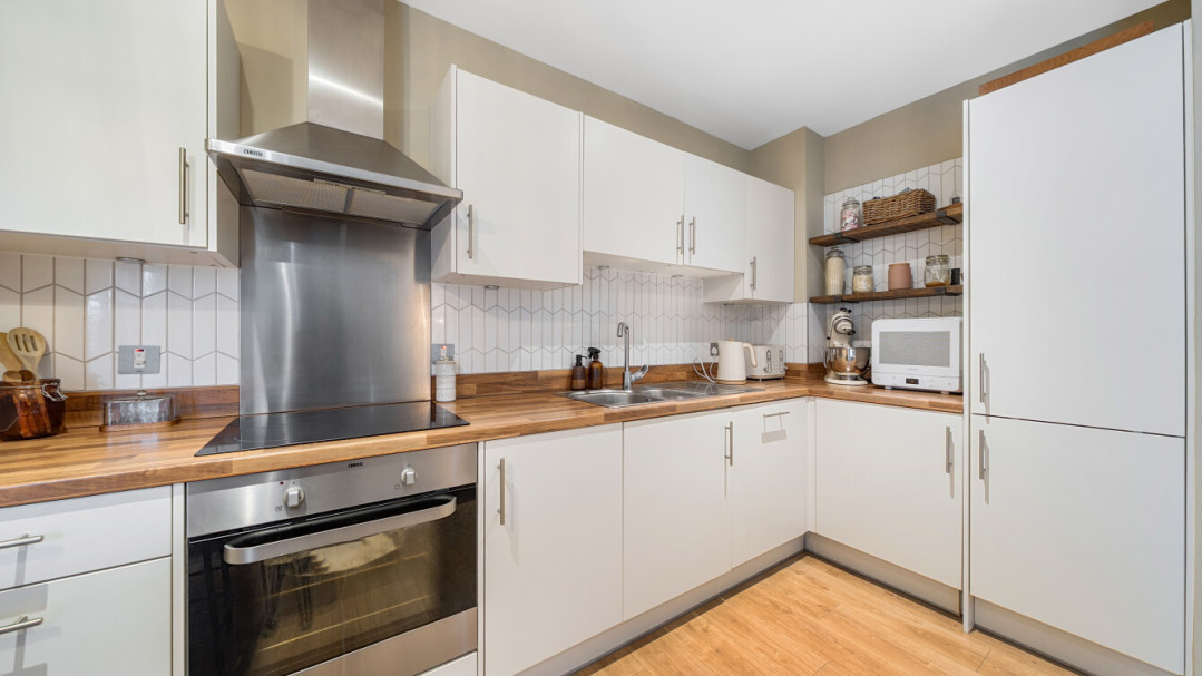 This bright and spacious apartment consists of a stylish open-plan kitchen and living area, flooded with natural light from wide floor-length windows. The kitchen is fitted with white gloss wall and base units, with under-cupboard lighting, and a wood effect worktop. The kitchen also benefits from integrated appliances including a fridge freezer, oven, hob, extractor fan and dishwasher. Main double bedroom benefitting from built-in storage cupboards. Bright and airy second double bedroom with floor-length windows. The bathroom comes complete with a white three-piece suite with a shower over bath and a stone tile surround. Additional double storage cupboards in hallway. One allocated parking space.