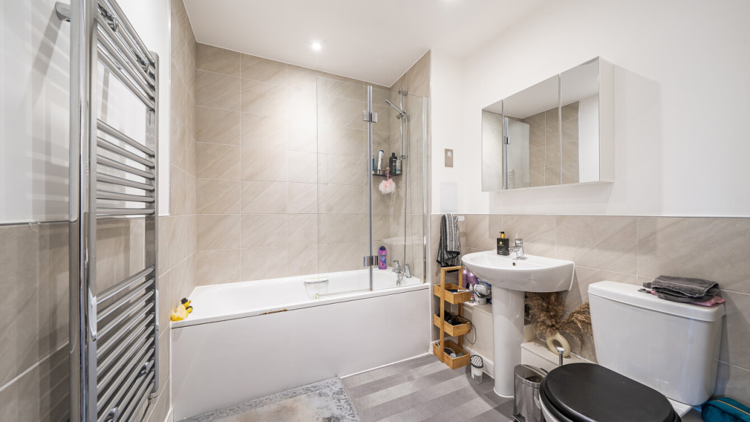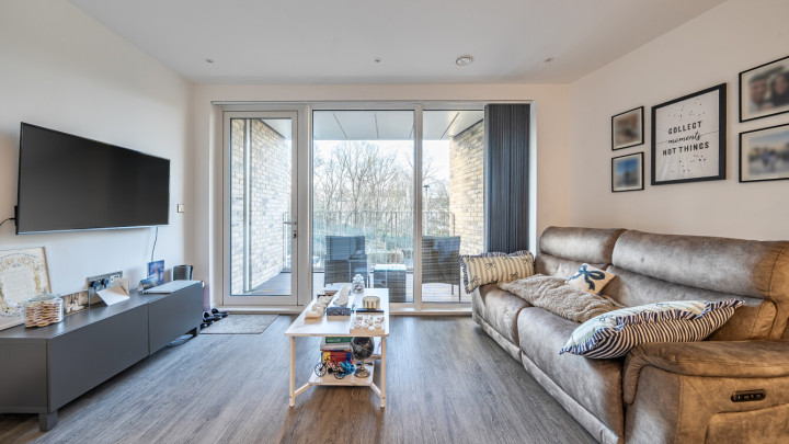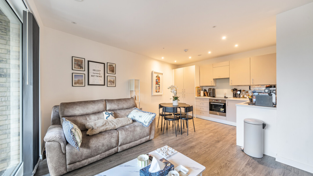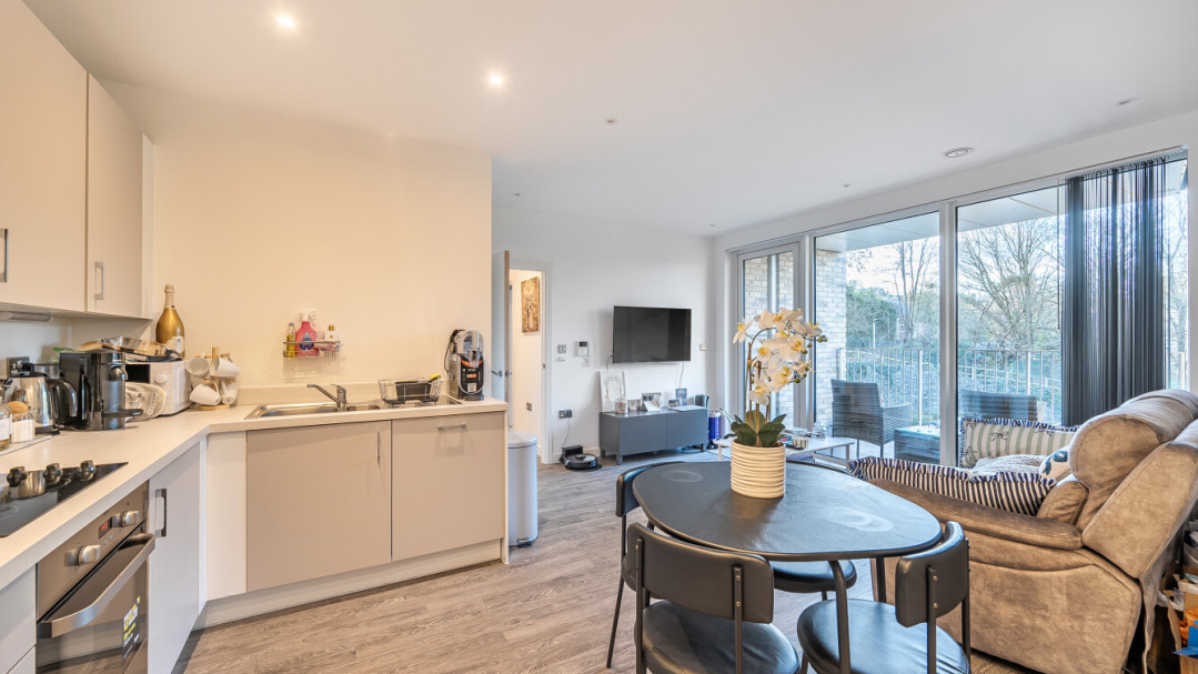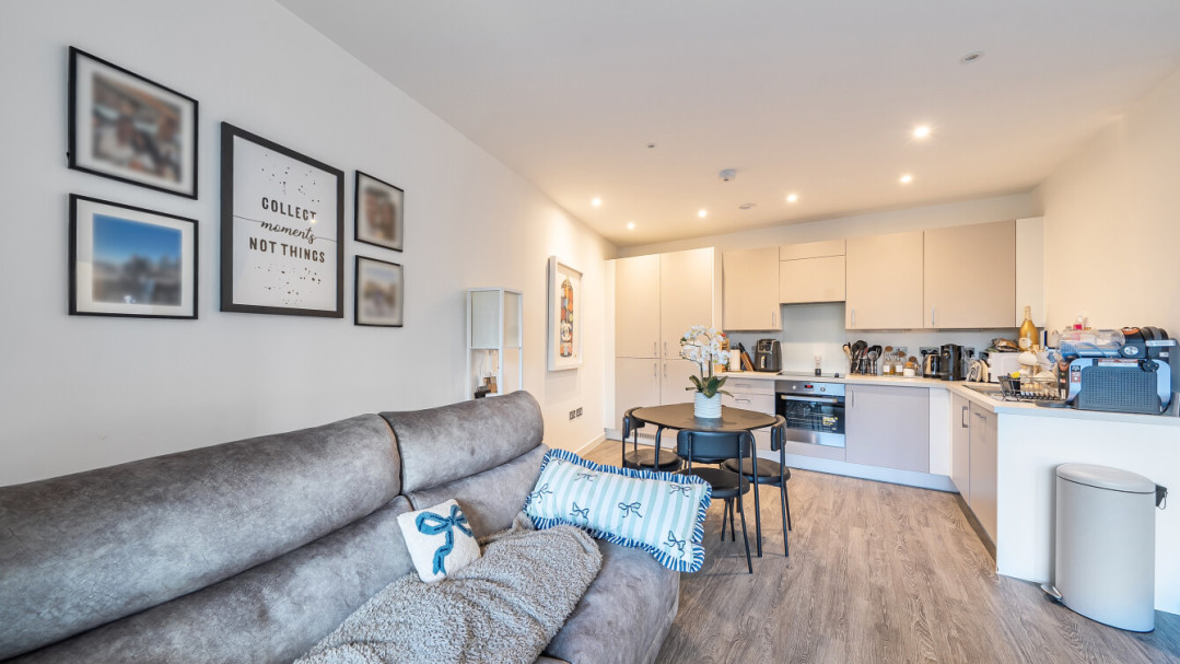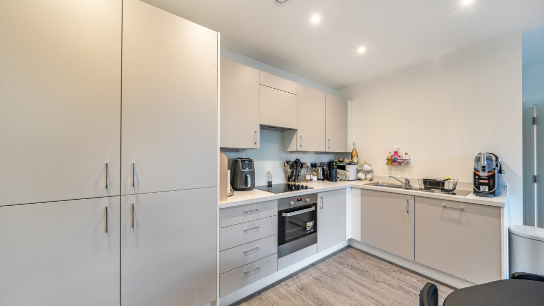 This bright and spacious one bedroom apartment has a stylish open-plan kitchen and living area, flooded with natural light from wide floor-length windows and access to the private balcony. The balcony is great for relaxing and entertaining. The kitchen is fitted with matt cream wall and base units and a white stone effect worktop. It also benefits from integrated appliances. The spacious double bedroom includes a built-in wardrobe. This room is also full of natural light. A contemporary bathroom completes the accommodation, with a white three piece suite with showerover bath.