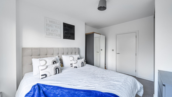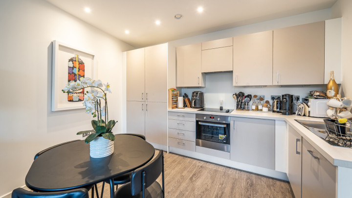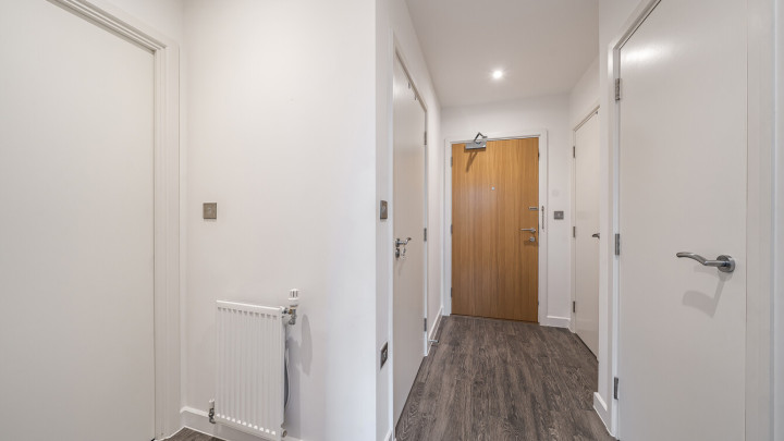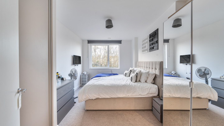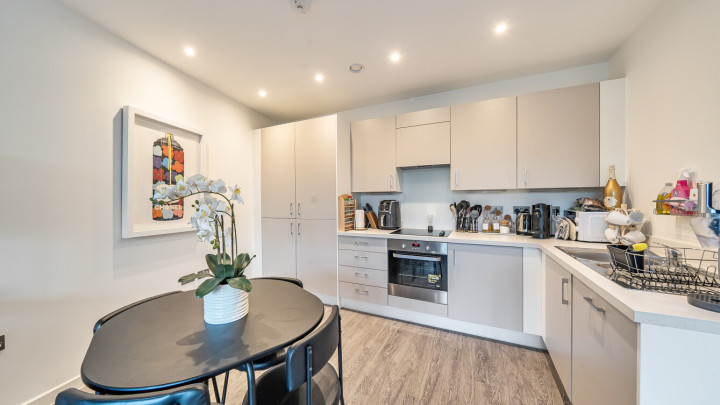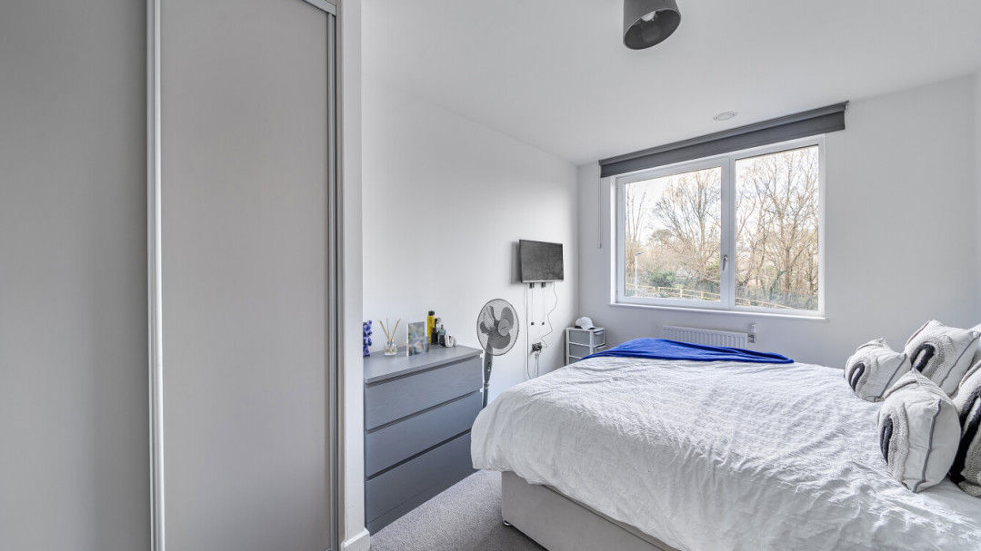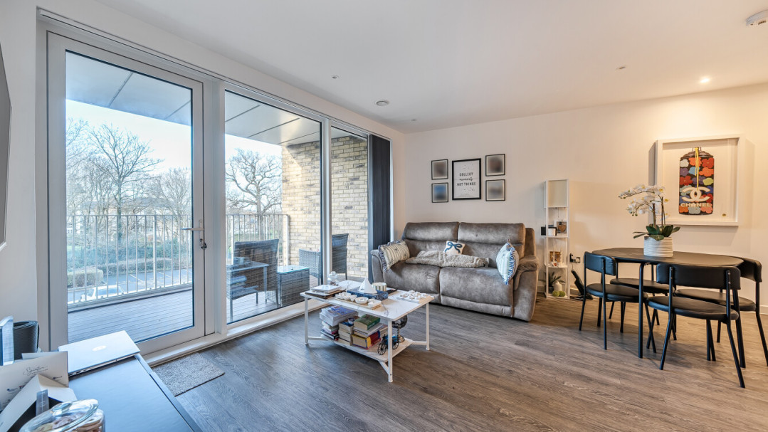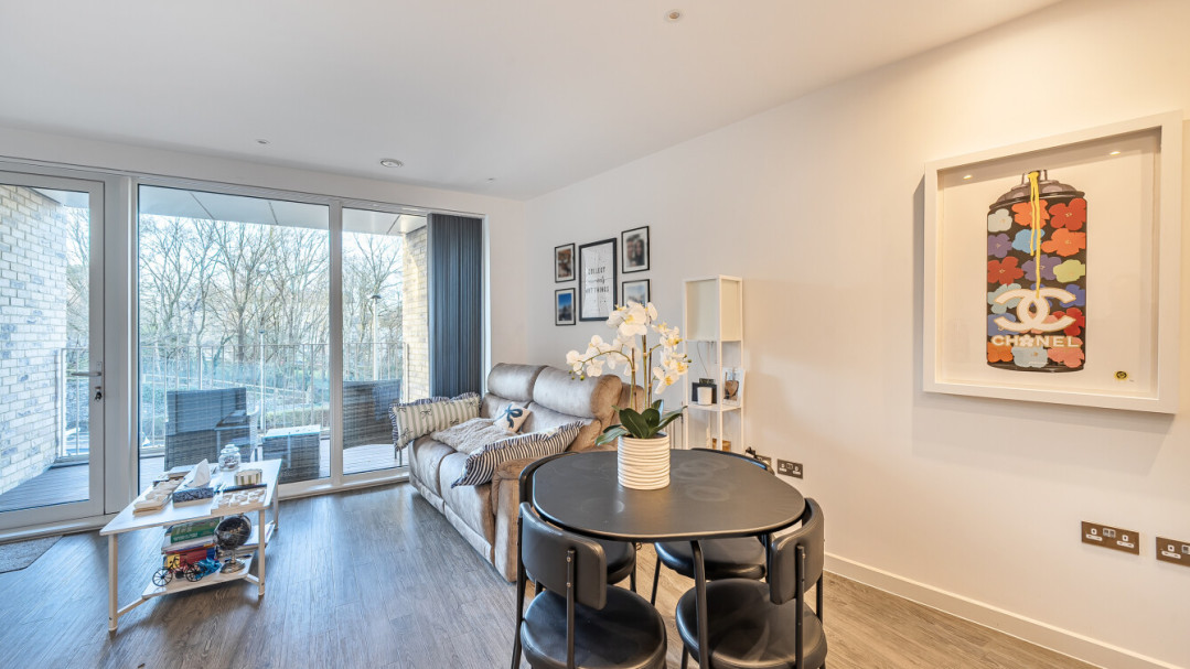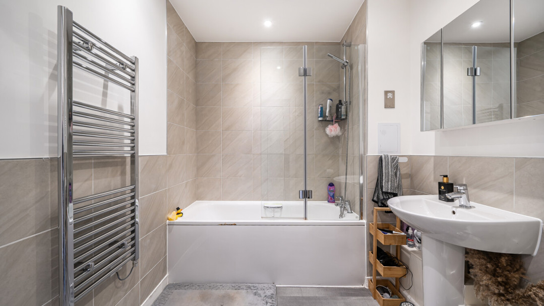 This bright and spacious one bedroom apartment has a stylish open-plan kitchen and living area, flooded with natural light from wide floor-length windows and access to the private balcony. The balcony is great for relaxing and entertaining. The kitchen is fitted with matt cream wall and base units and a white stone effect worktop. It also benefits from integrated appliances. The spacious double bedroom includes a built-in wardrobe. This room is also full of natural light. A contemporary bathroom completes the accommodation, with a white three piece suite with showerover bath.