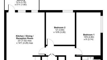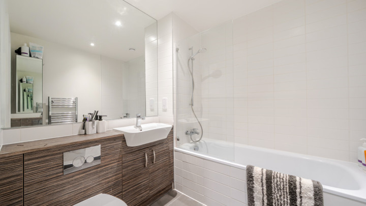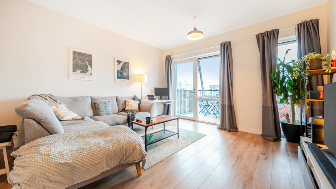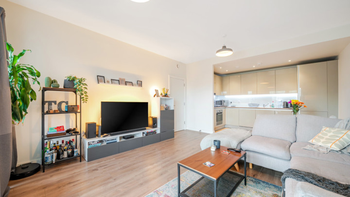 This bright and stylish apartment consists of a stylish multi aspect open-plan kitchen and living area, flooded with natural light from wide floor-length windows and door to private balcony. The kitchen is fitted with grey gloss wall and base units, with under-cupboard lighting, and a light wood effect worktop. The kitchen also benefits from integrated appliances including a fridge freezer, oven, hob, extractor fan and dishwasher. Two bright and airy double bedrooms. The bathroom comes complete with a white three-piece suite with a shower over bath and a white tile surround. Additional storage cupboard in hallway.