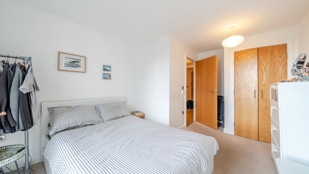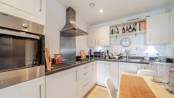 Enter this spacious well maintained apartment via a central hallway with storage. The open-plan kitchen and living area, is flooded with light from the wide floor-length windows, leading onto a south facing private balcony. The kitchen is fitted with modern gloss units with integrated appliances including a fridge freezer, oven, hob, extractor fan and dishwasher. A generous double bedroom incorporates in-built storage. The contemporary bathroom, with a white three piece suite, completes the accommodation.