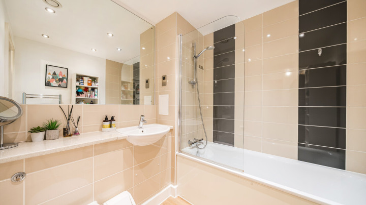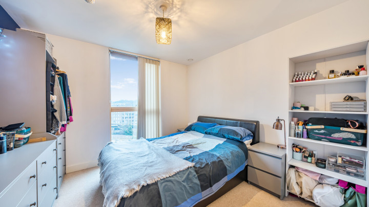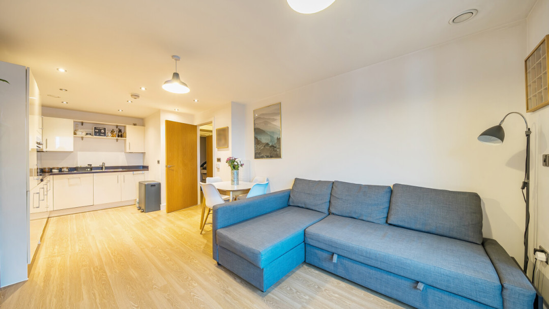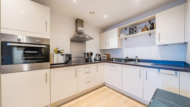 Enter this spacious well maintained apartment via a central hallway with storage. The open-plan kitchen and living area, is flooded with light from the wide floor-length windows, leading onto a private balcony. The kitchen is fitted with modern gloss units with integrated appliances including a fridge freezer, oven, hob, extractor fan and dishwasher. A generous double bedroom incorporates in-built storage. The contemporary bathroom, with a white three piece suite, completes the accommodation.