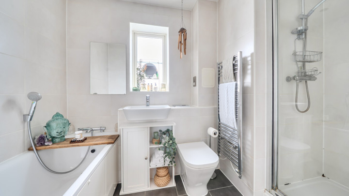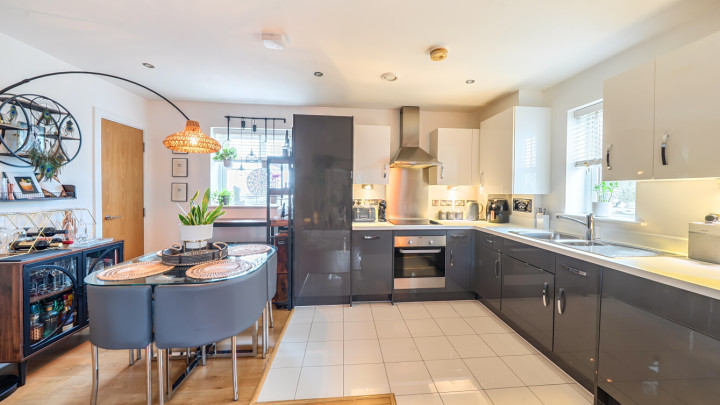 Enter this two bedroom apartment via a hallway with storage. A well proportioned triple aspect L-shaped open plan reception room has a door leading onto a private south west facing balcony. The kitchen is fitted with a range of high gloss units and includes an integrated appliances. There are two double bedrooms of equal size but with one incuding a fitted wardrobe. The second bedroom is currently being used as a generous home office. A contemporary four piece bathroom, with separate shower, completes the accommodation.