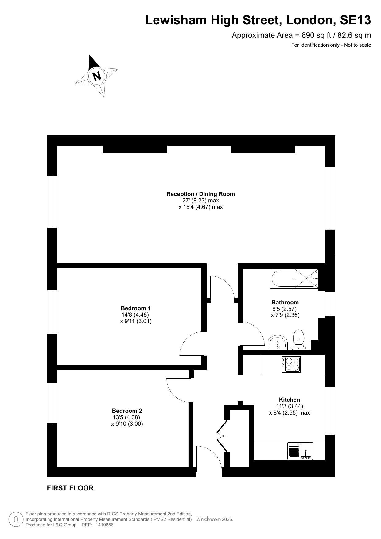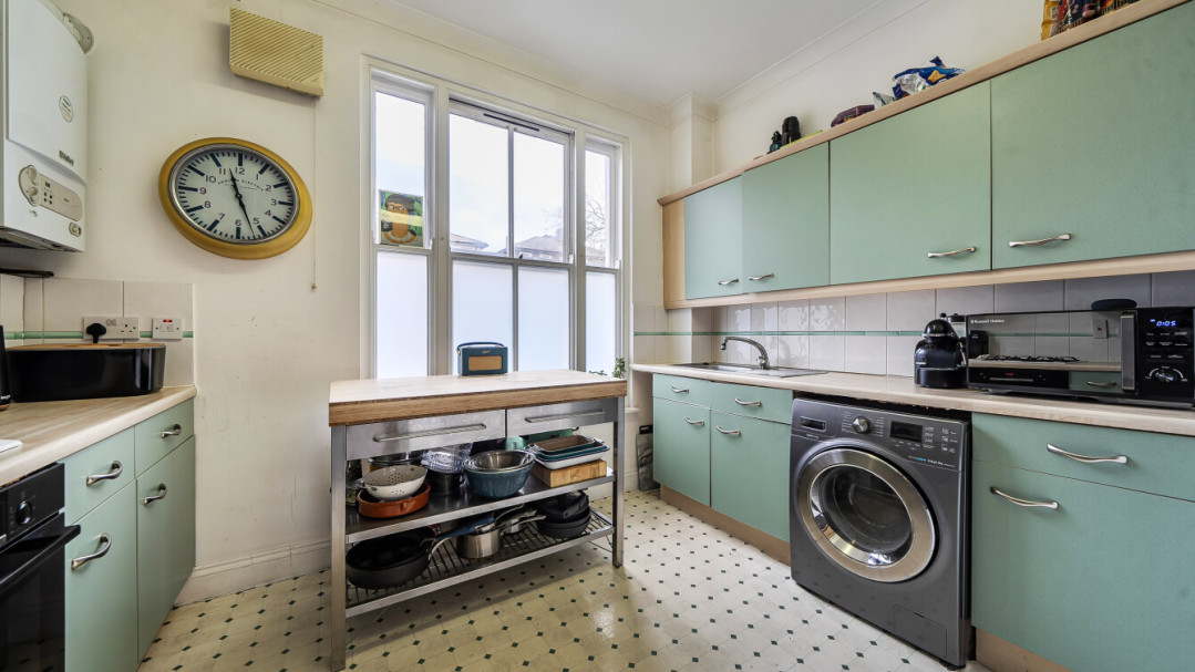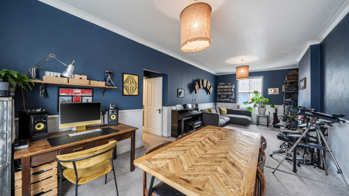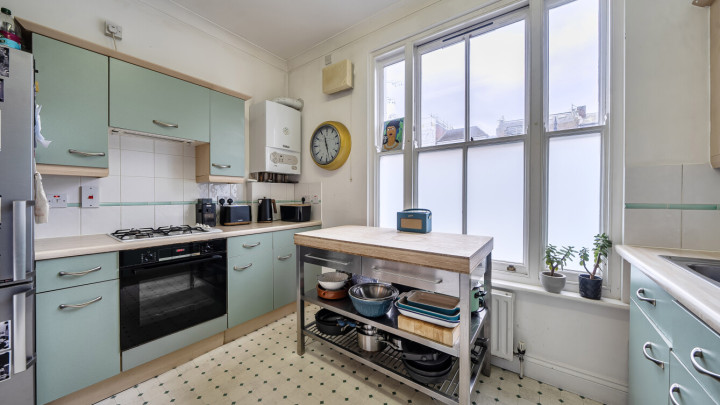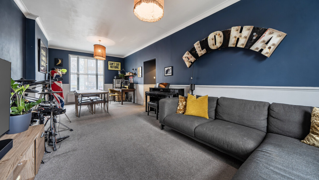 This dual aspect spacious upper ground floor apartment is situated in an Edwardian style building located on Lewisham High Street. The large reception room has a dual east-west aspect and like the rest of the apartment, features high ceilings and sash windows. This room also features dado rails. There is a large separate kitchen, with a range of wall and base units, which could accommodate a breakfast table. The two well proprtioned double bedrooms face west. A generous, part tiled family bathroom with a rainshower over the bath, completes the accommodation.