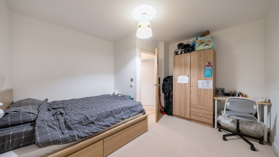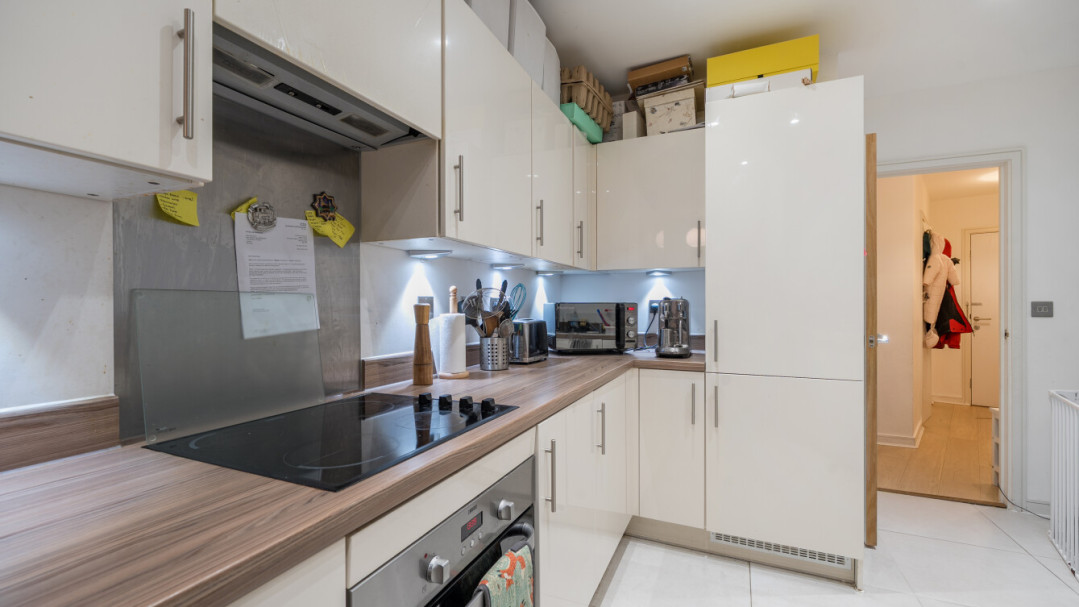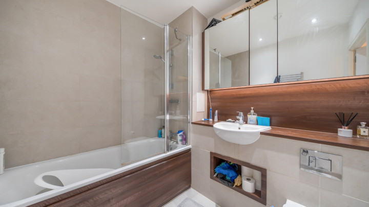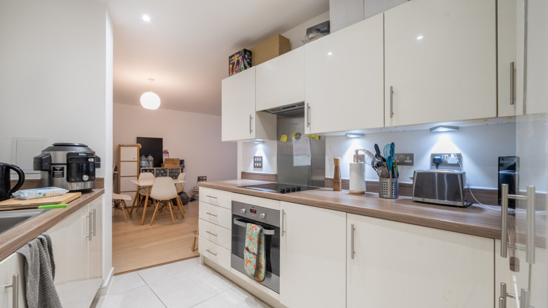 This bright and spacious two bedroom apartment consists of a stylish open-plan kitchen and living area, flooded with natural light from wide floor-length windows. The kitchen is fitted with cream wall and base units and oak effect worktops. The kitchen also benefits from integrated appliances. Spacious main double bedroom and a good sized second double bedroom with built in wardrobes. The bathroom comes complete with a white three-piece suite with a shower over bath and a stone tile surround with walnut effect panelling. Additional double storage cupboards in hallway. One allocated parking space.