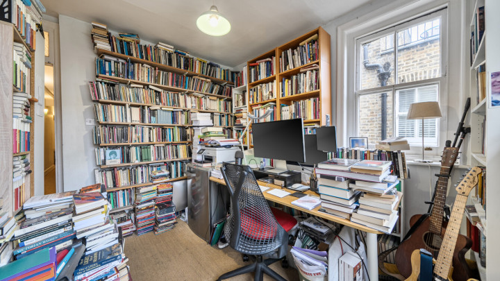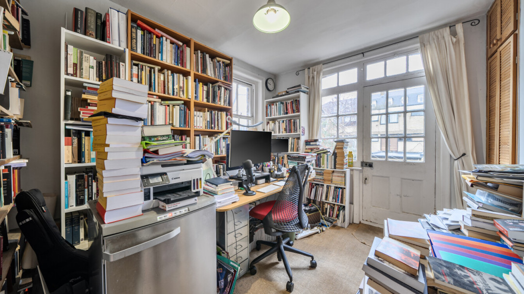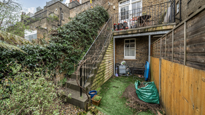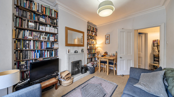 The main reception room in this apartment features a bay window and open fireplace. Behind this is a double bedroom and then following down the hallway, find a family bathroom with shower cabinet, basin and WC, then a single bedroom. The kitchen it fitted with a range of floor and wall cupboards and includes an integrated oven, hob and extractor, with spaces for white goods. to the very rear of the property is the third bedroom, a double, currently used as a home office and which has a door to a small decked area leading down steps into a mature private garden.