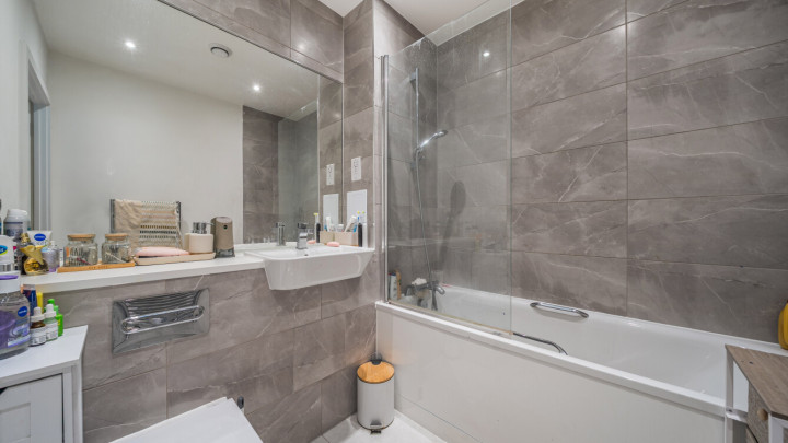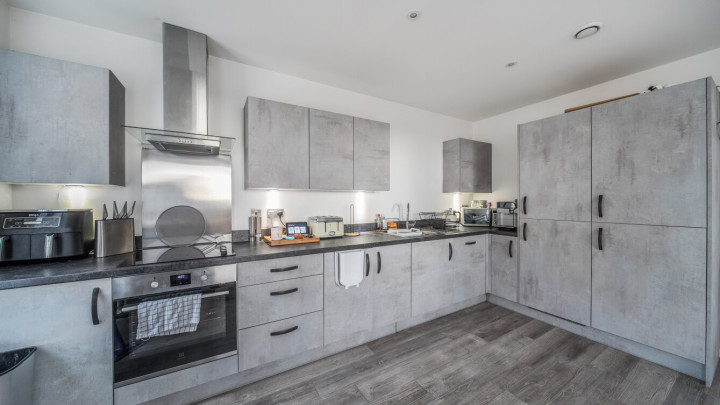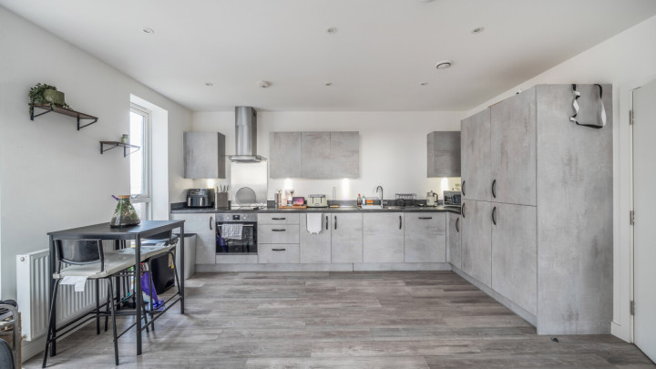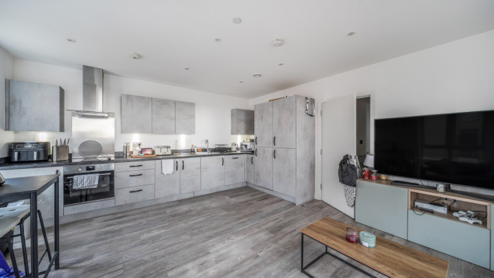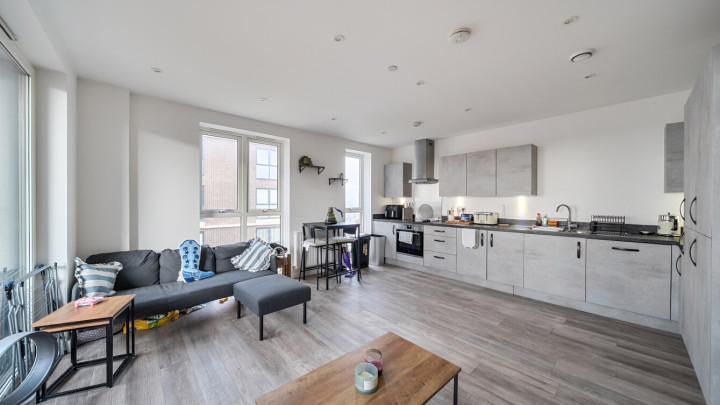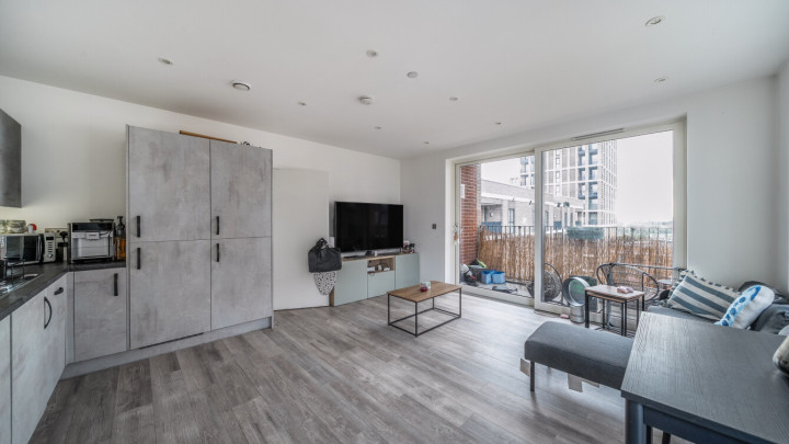 This apartment centres on a dual aspect open-plan kitchen and living area, flooded with natural light, which opens onto a private south facing balcony. The modern kitchen is fitted with matt effect wall and base units, with stylish under-cupboard lighting, and a marble effect worktop. It also benefits from integrated appliances including a fridge freezer, oven, hob, extractor fan and dishwasher. The generous double bedroom includes in-built storage. A contemporary family bathroom completes the accommodation. There is a visitor parking allowance of 100 hours per calendar month, however no parking space allocated with this property.