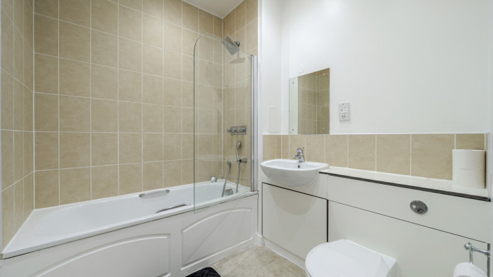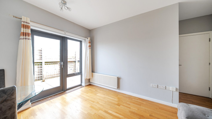 Enter this one bedroom dual aspect apartment via a central hallway with storage. To your left find a good sized south facing double bedroom with fitted wardrobe and a bathroom with a rainshower head over the bath and a glass shower screen. On the other side of the hallway there is a separate kitchen fitted with a range of white wall and base units with black work surfaces and including an integrated oven, hob and extractor and spaces for your other white goods. The reception room opens onto a full width balcony large enough to dine and to relax.
