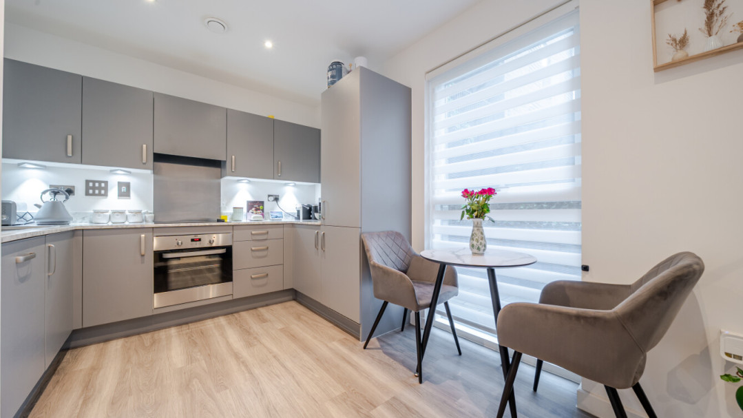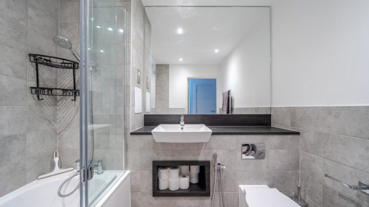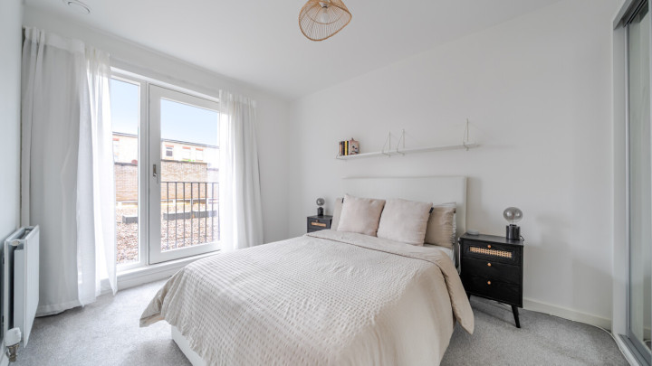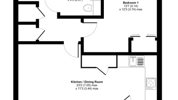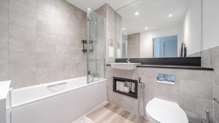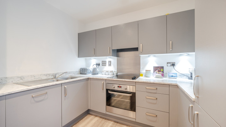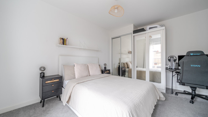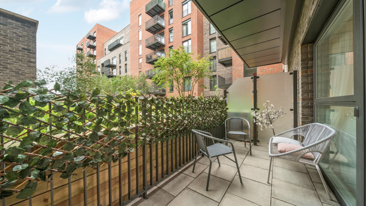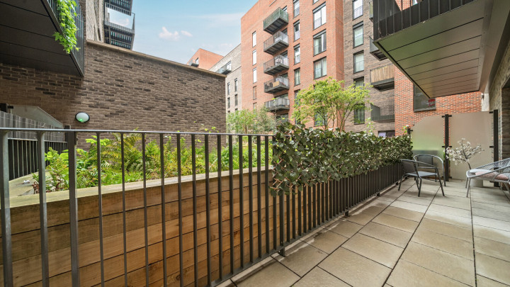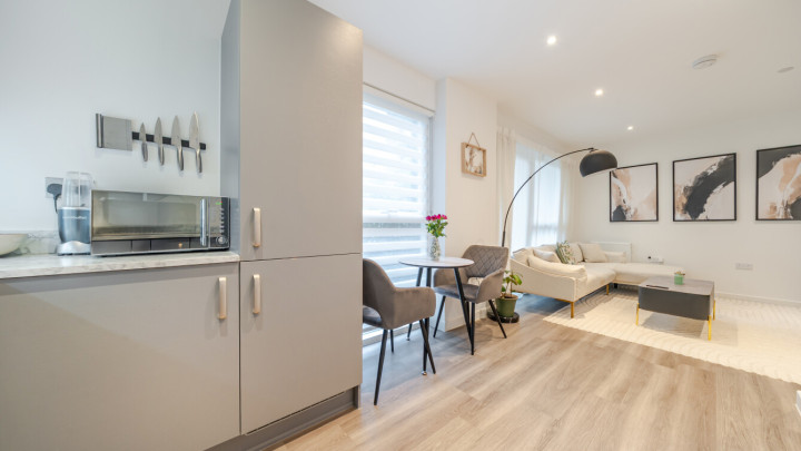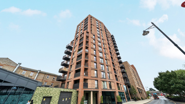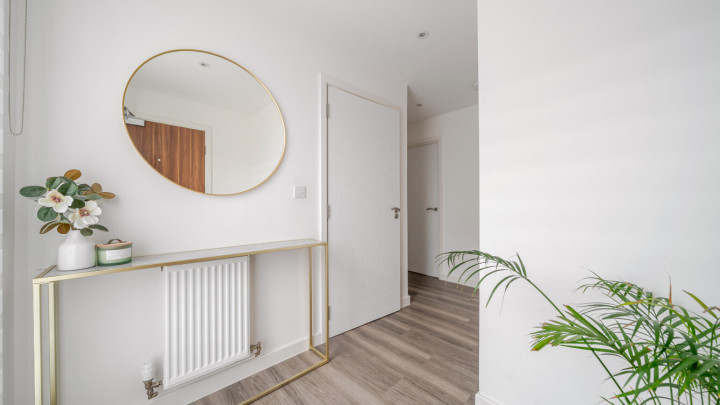 Enter this bright and spacious dual aspect one bedroom apartment via a spacious hallway with storage upboards. The open plan living area, flooded with natural light from wide floor-length windows, leads to a private full width south facing balcony. The kitchen is fitted with matt grey wall and base units, with under-cupboard lighting, and a white marble effect worktop. It also benefits from integrated appliances including a fridge freezer, oven, hob, extractor fan and dishwasher and washer/dryer. The well proportioned bedroom, which has a juliet balcony, also includes mirrored wardrobes. A contemporary bathroom with a white three-piece suite and shower over bath completes the accommodation.