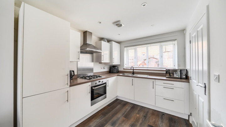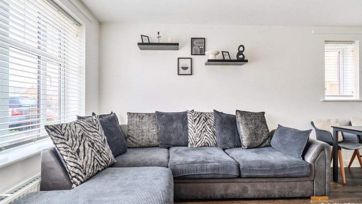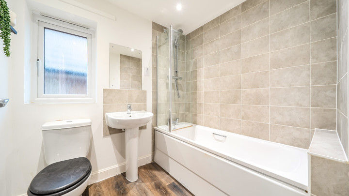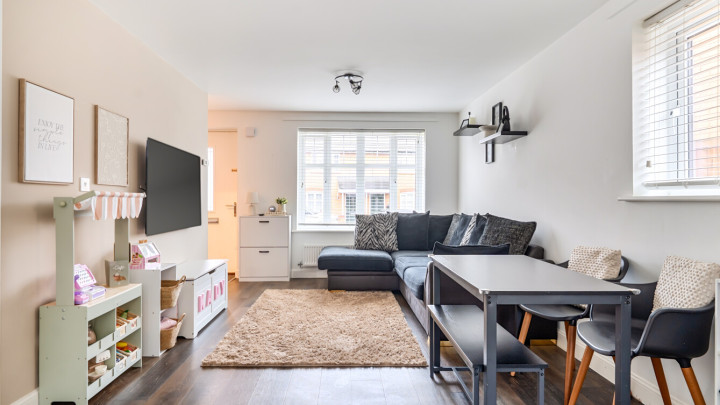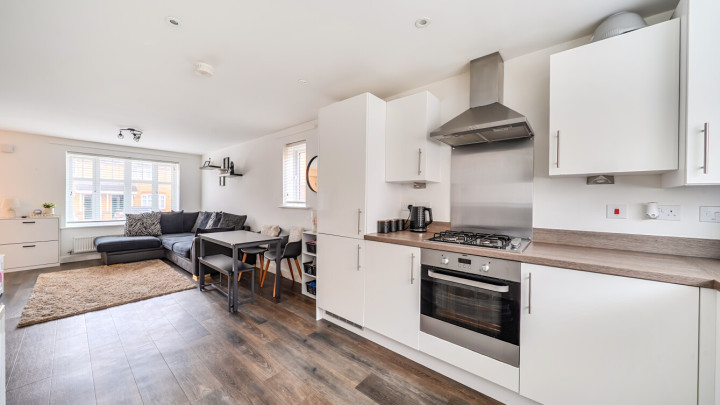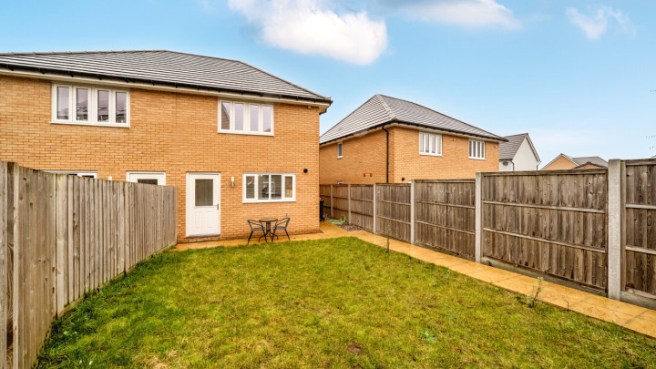 The ground floor of this bright and spacious semi-detached house consists of a stylish open-plan kitchen and living area, flooded with natural light. The kitchen is fitted with white wall and base units and a wood effect worktop. It also benefits from integrated appliances including a fridge freezer, oven, hob and extractor fan. To the rear of the kitchen is a lobby area providing access to the garden and a downstairs cloakroom/WC. The south-east facing garden is laid mainly to lawn with a small patio area and shed. On the first floor find a spacious main double bedroom to the front of the house, benefitting from built-in storage cupboards. The bright and airy second double bedroom also comes with built in storage. The bathroom comes complete with a white three-piece suite with a shower over bath and a stone tile surround.