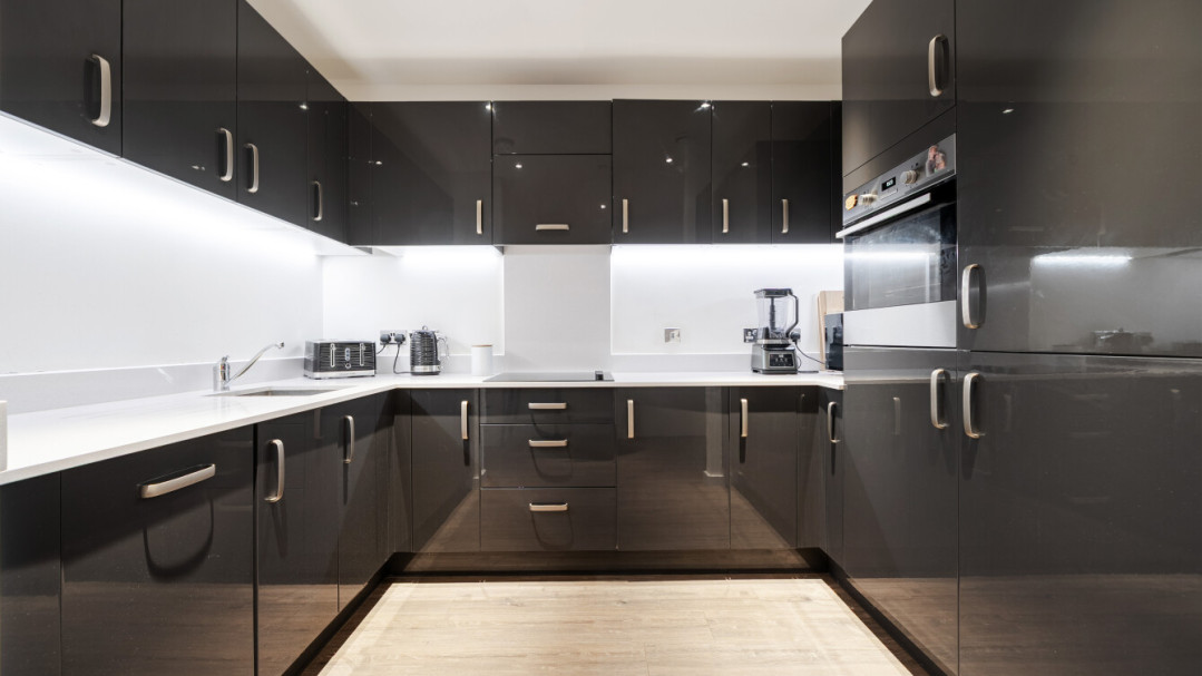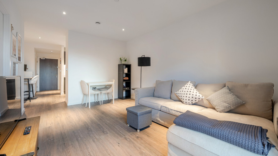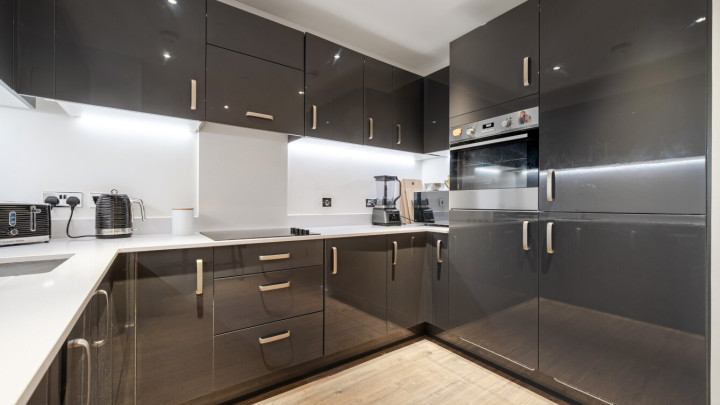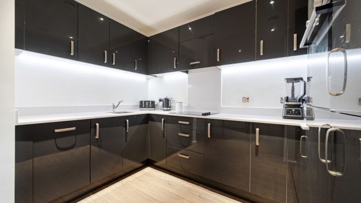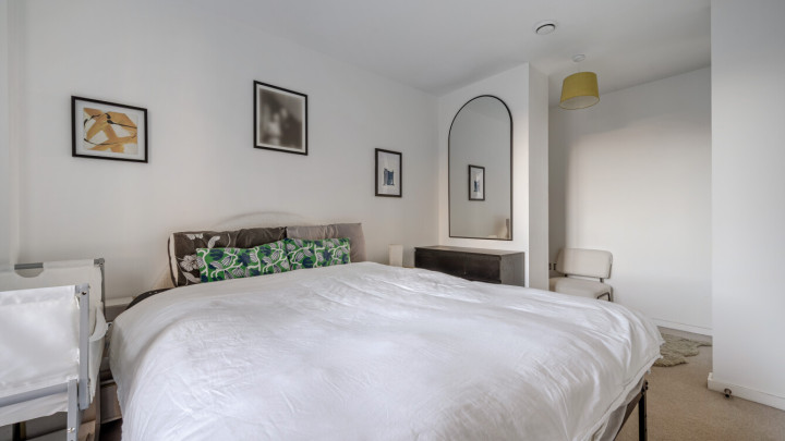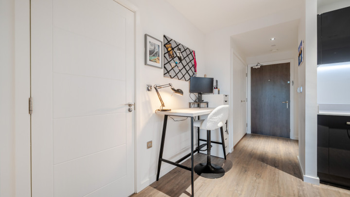 Enter this well presented and spacious one bedroom apartment via a hallway, with good storage, which leads past a modern kitchen fitted with high gloss units and includes fully integrated appliances, into the reception area, which in turn opens onto an east facing private balcony. Opposite the kitchen is an ideal nook for a home office. The generous double bedroom features a dressing area with fitted wardrobe and also has a window overlooking the balcony. A contemporary bathroom completes the accommodation.