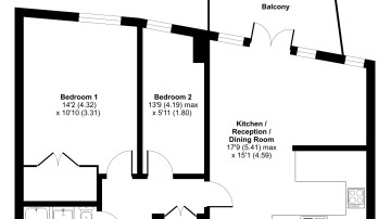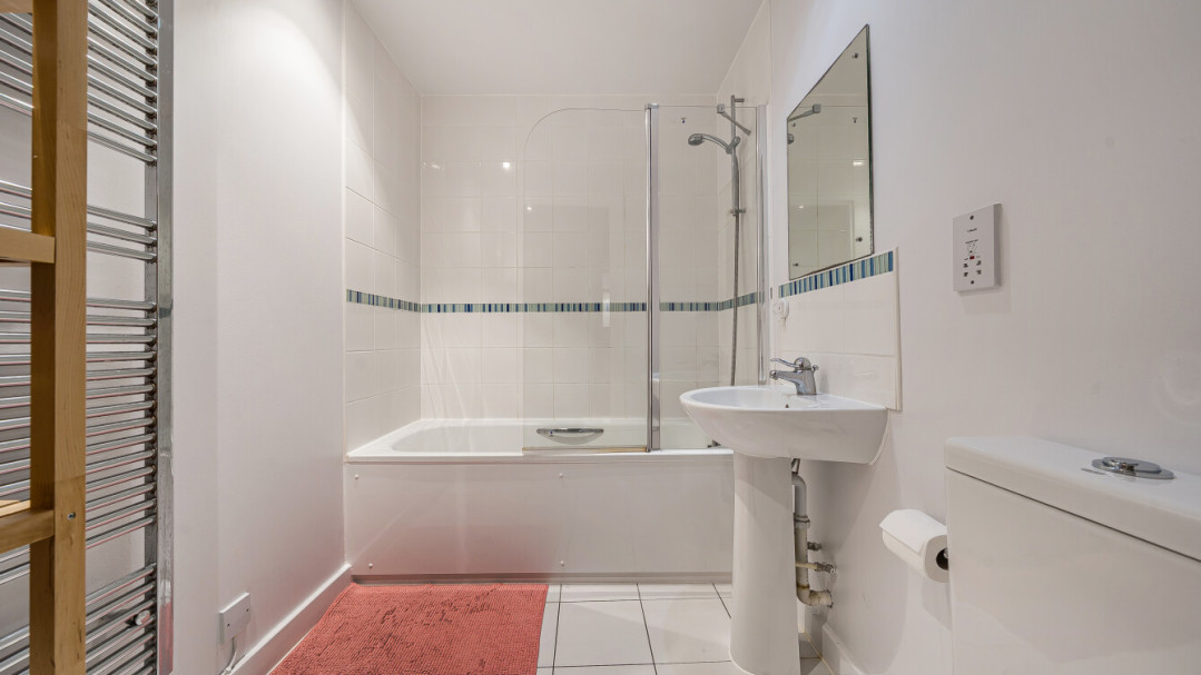 This bright and spacious two bed apartment consists of a stylish open-plan kitchen and living area, flooded with natural light from wide floor-length windows and a door leading to good sized balcony. The kitchen is fitted with white wall and base units, and black marble effect worktop, with integrated oven, hob and extractor fan and spaces for your white goods. The well proportioned main bedroom benefits from a built in wardrobe. The second bedroom is ideal as a nursery or home office. A bathroom complete with a white three-piece suite with a shower over bath completes the accommodation.