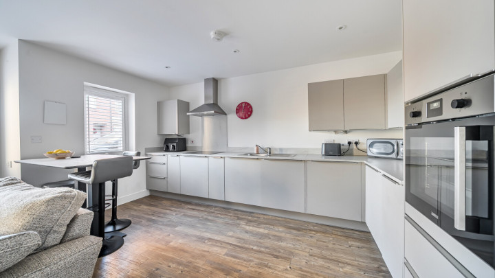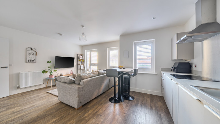 Internally, the home comprises a modern open-plan kitchen and living area. The kitchen is fitted with matt grey wall and base units, under-cupboard lighting and a light grey stone-effect worktop, offering generous counter space, along with integrated appliances including a fridge freezer, oven, hob, extractor fan and dishwasher.