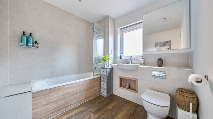 The generously sized bathroom has been designed to support accessibility requirements and offers excellent manoeuvrability. It is fitted with a modern white three-piece suite, shower over bath and stone-tile surround, and benefits from a window providing natural light and ventilation.