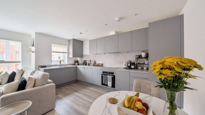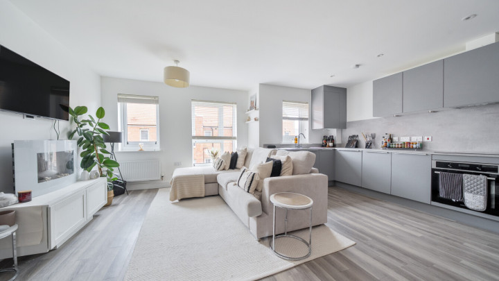 Enter this beautifully presented modern apartment via a hallway with a walk-in storage cupboard. The bright west facing open plan reception area includes a kichen with fully integrated appliances. A generous bedroom benefits from a built-in wardrobe and a contemporary bathroom completes the acommodation. There is Amtico flooring to high traffic areas and neutral carpet to the bedroom.