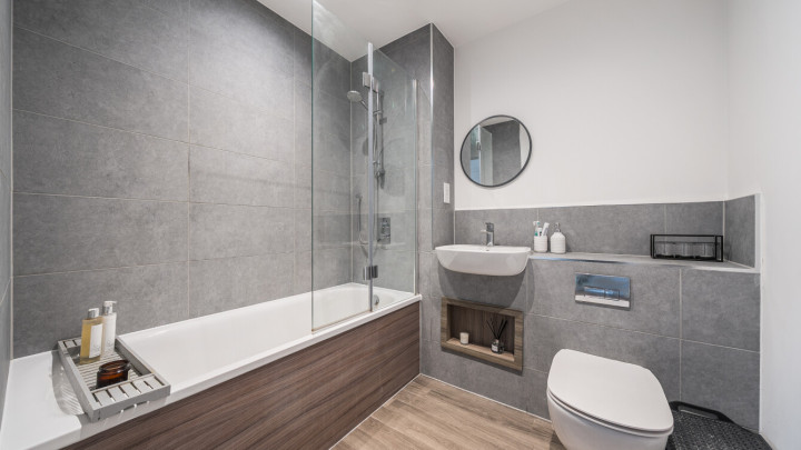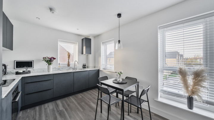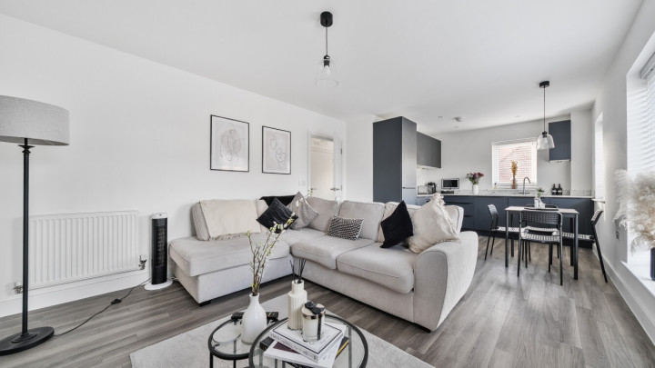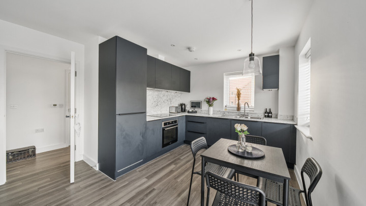 This apartment consists of an open-plan kitchen and living area, flooded with natural light. The kitchen is fitted with dark grey wall and base units, with stylish under-cupboard lighting, and a white gloss marble effect work surface and benefits from integrated appliances including a fridge freezer, double oven, hob, and extractor fan. The spacious double bedroom includes a fitted wardrobe. A contemporary bathroom and walk-in store complete the accommodation. Exclusive use of allocated parking bay.