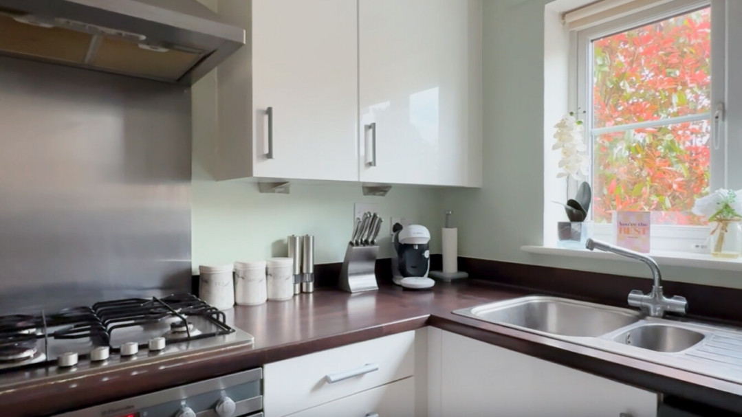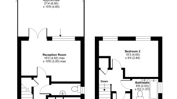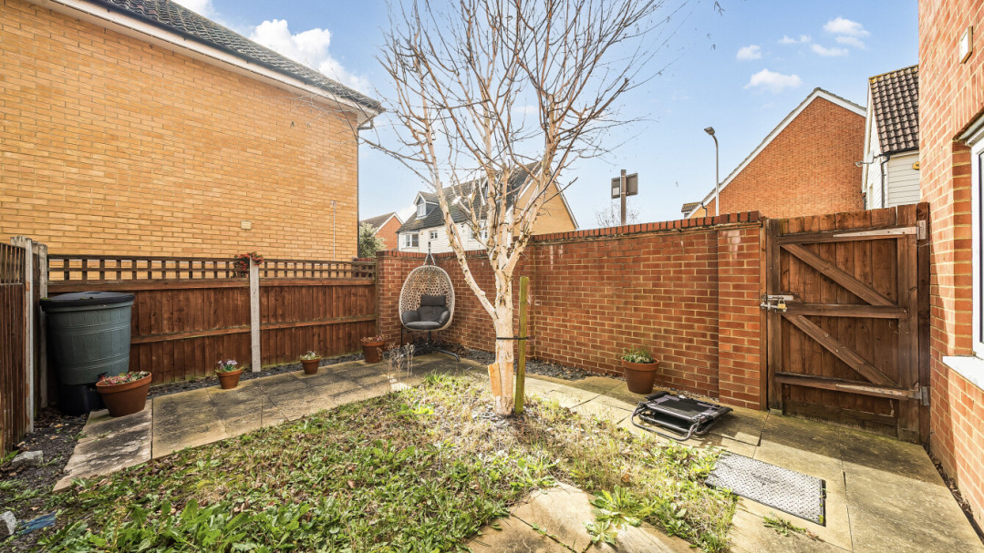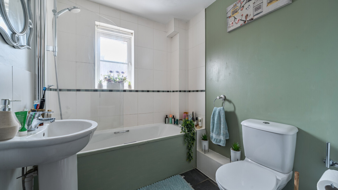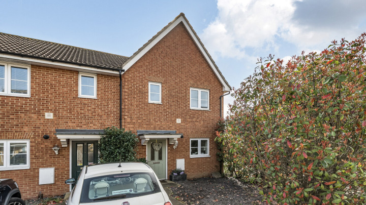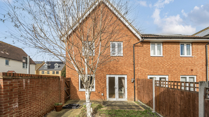 On the ground floor of this well presented home find the modern kitchen to the front of the house. Fitted with white high gloss units, it includes an integrated oven, hob and extractor and spaces for white goods. To the rear, a bright and sunny reception room opens via patio doors onto a secluded garden with both lawn and paved areas. There is also a guest WC/cloakroom. On the first floor find two equally sized double bedrooms and a family bathroom with a shower over the bath and glass shower screen.