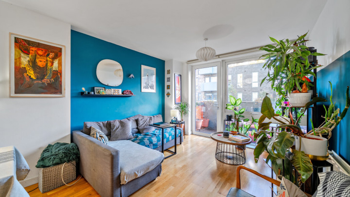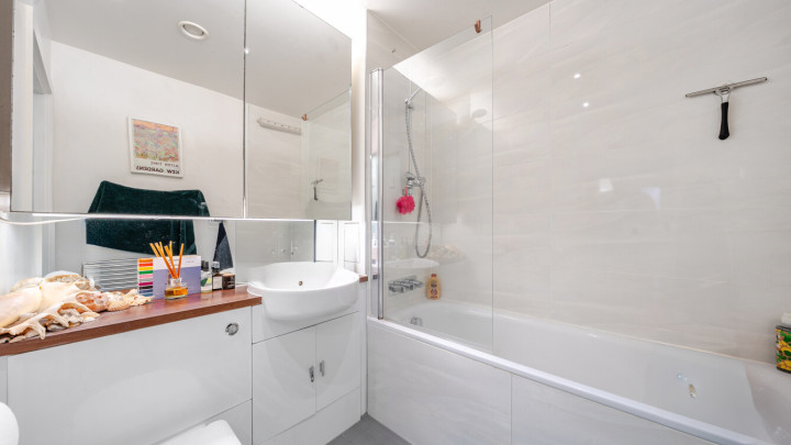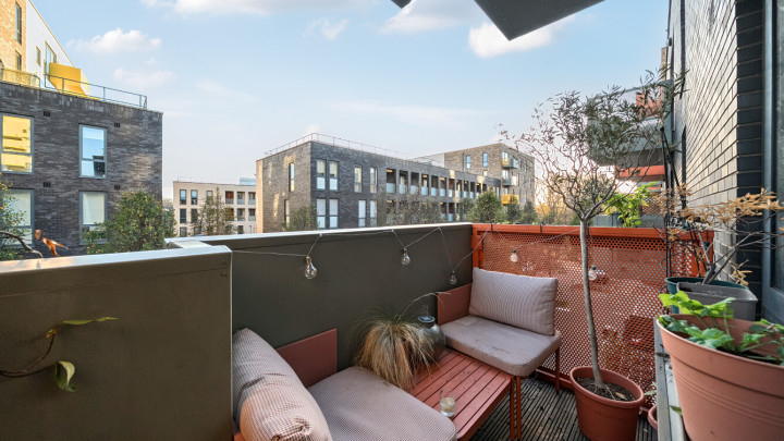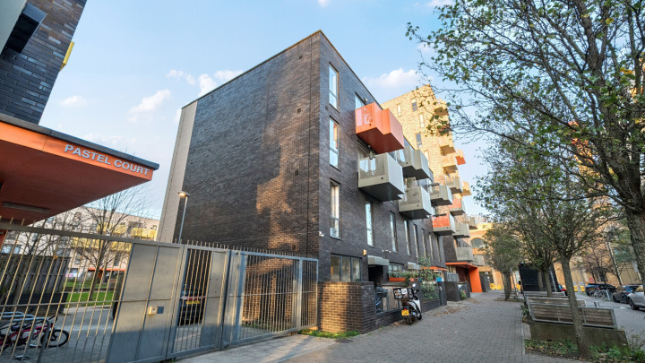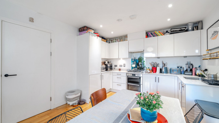 Enter this modern triple aspect apartment via a spacious hallway with storage. The dual aspect open plan living area opens onto a south facing private balcony overlooking the communal gardens and a modern kitchen includes integrated appliances. There are two double bedrooms, one with benefit of built-in storage. A contemporary bathroom with shower over bath, completes the accommodation.