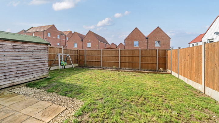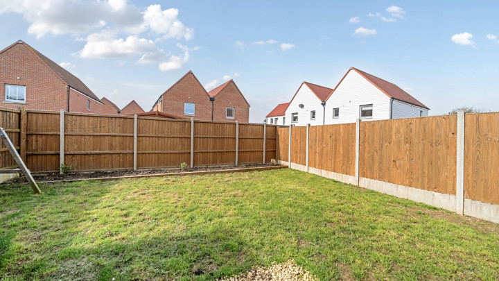 Enter this spacious modern house via a generous hallway with understairs storage and access to cloakroom/WC. To the front of the house is a modern kitchen featuring fully integrated appliances. The dual aspect sitting/dining room is to the rear with patio doors leading into a large south facing private garden, laid mainly to lawn but with a patio, shed and side access to the driveway parking. On the first floor, find two well proportioned double bedrooms, each with integrated storage, served by a contemporary bathroom with sower over bath and folding glass shower screen.