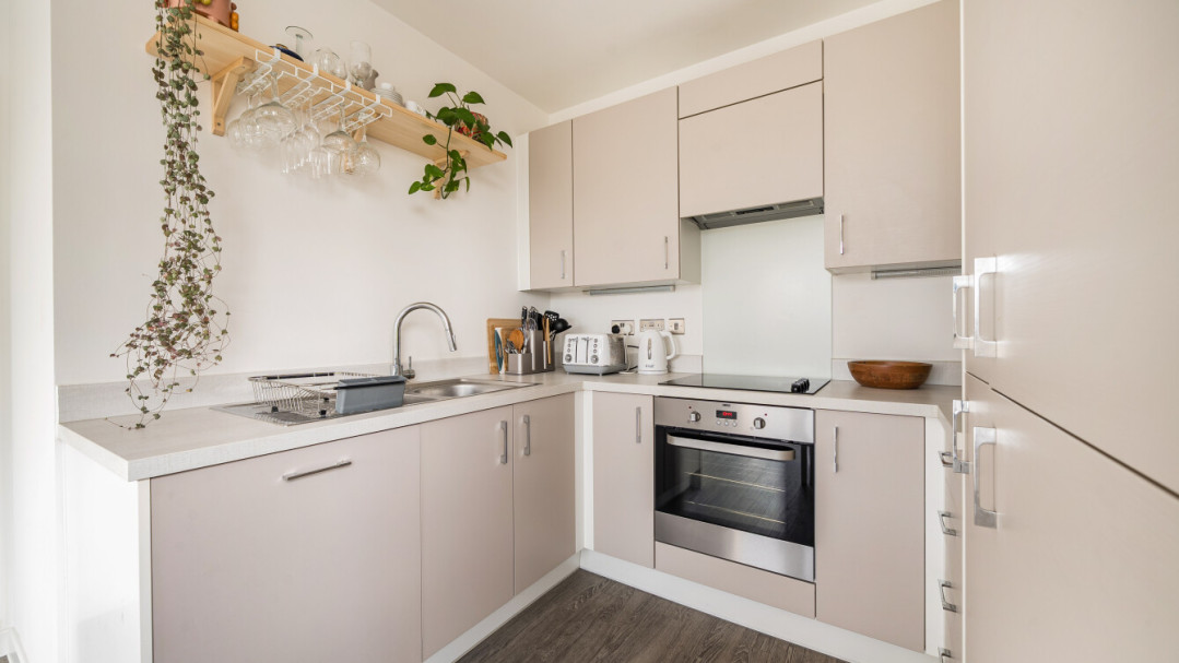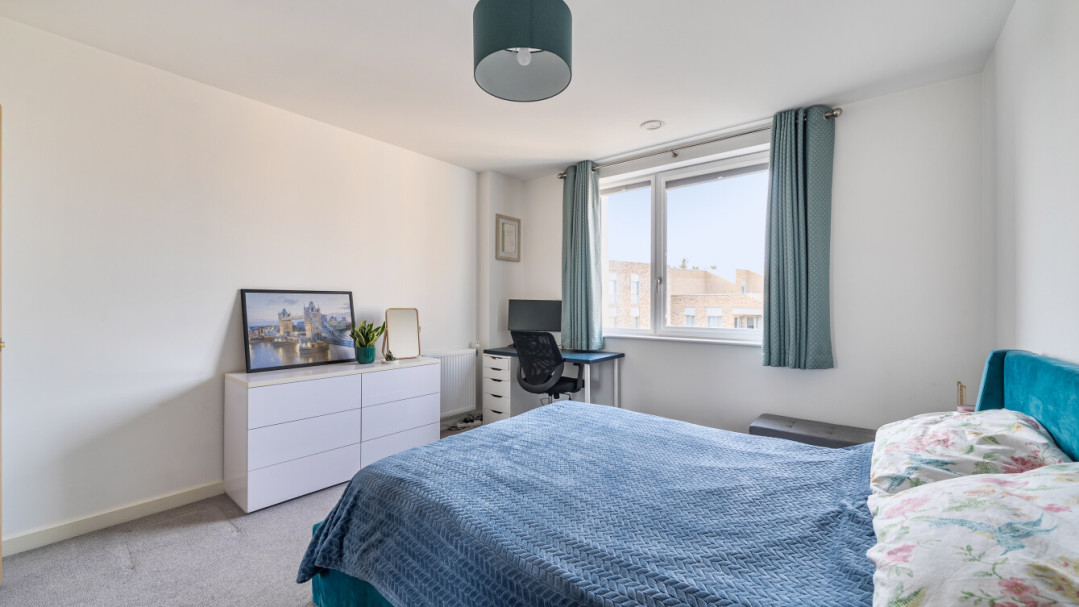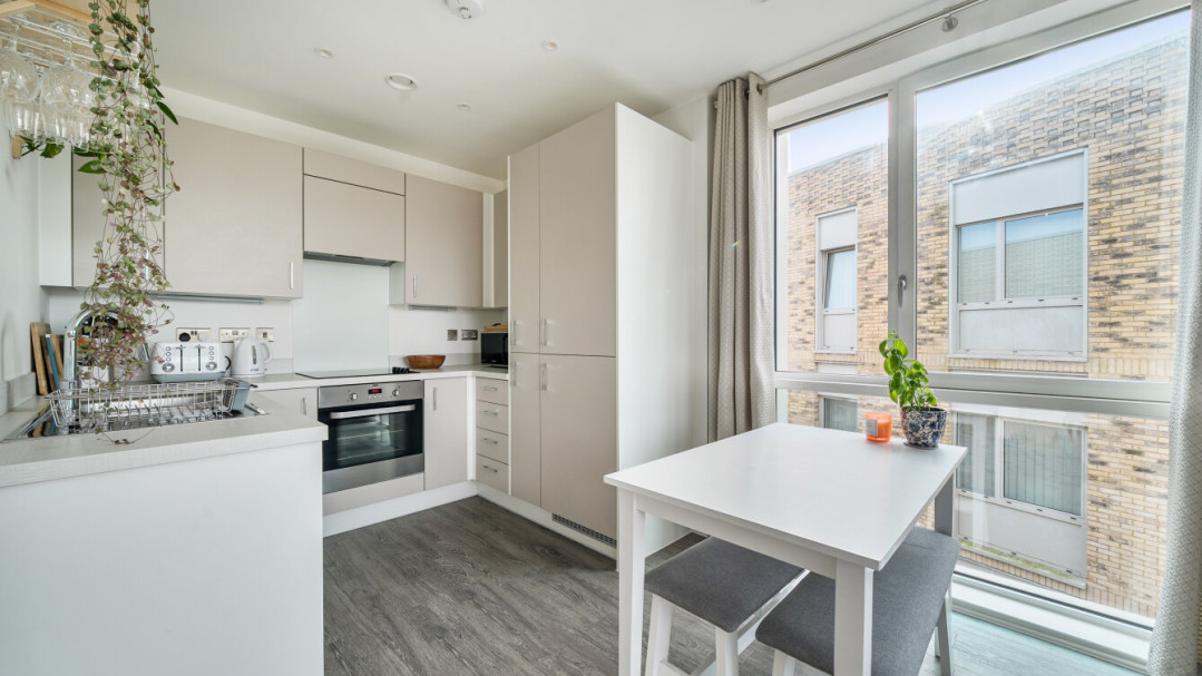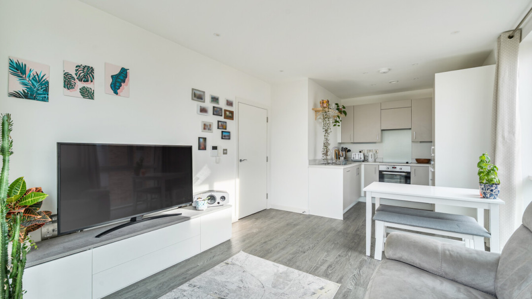 Enter this dual aspect apartment via a spacious hallway with storage. The light and bright open plan reception room has a south and east facing aspect opening onto a private balcony overlooking the communal gardens. The modern kitchen includes fully integrated appliances. A generous bedroom incudes a fitted wardrobe with sliding doors and has room for a home office. The accommodation is completed with a contemporary bathroom.