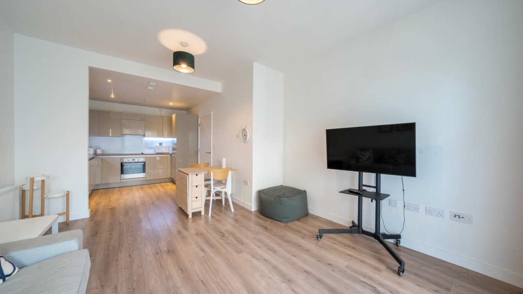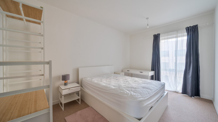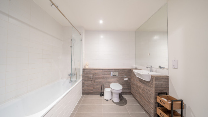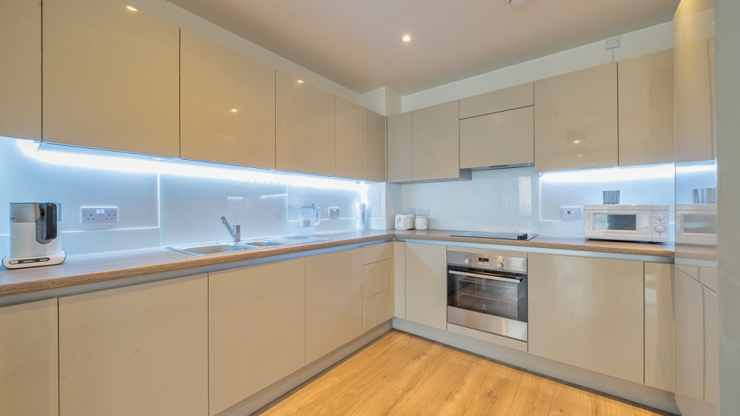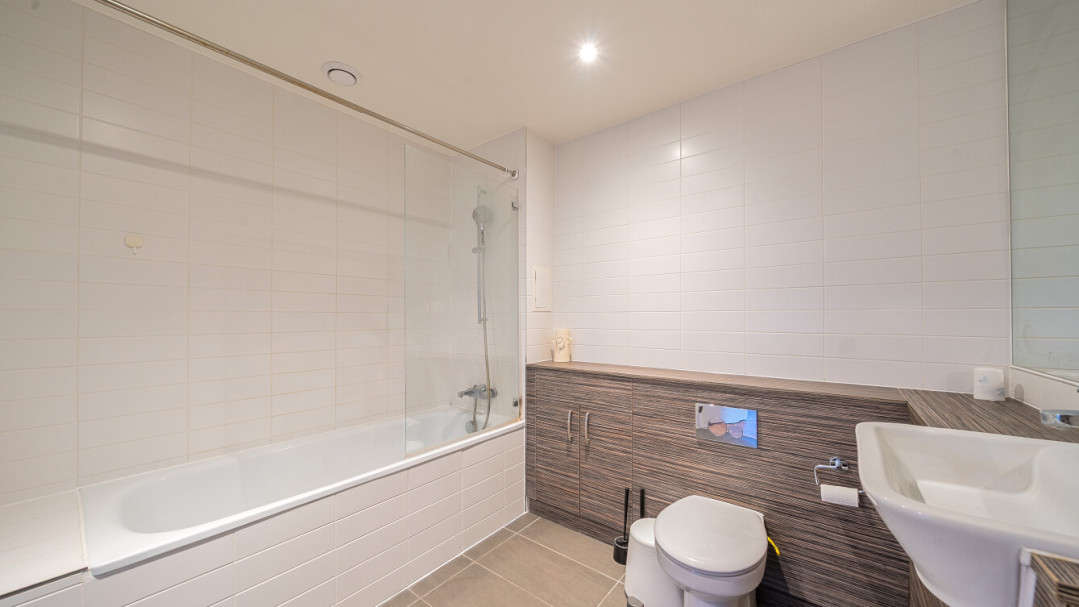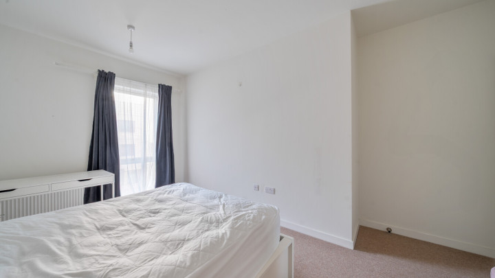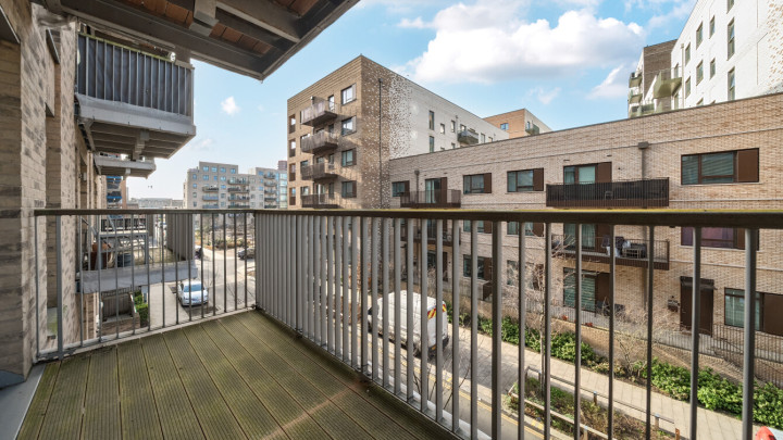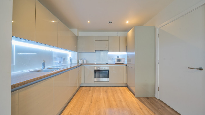 The hallway of this bright and spacious dual aspect two-bedroom apartment includes three large strorage cupboards. A stylish open plan living area, flooded with natural light from wide floor-length windows and door opens onto a private balcony. The kitchen, fitted with modern high gloss units finished with a wood effect worktop, benefits from integrated appliances including a fridge freezer, oven, hob and extractor fan. There are two well proportioned bedrooms and a contemporary bathroom complete with a white three-piece suite with a shower over bath and a tile surround.