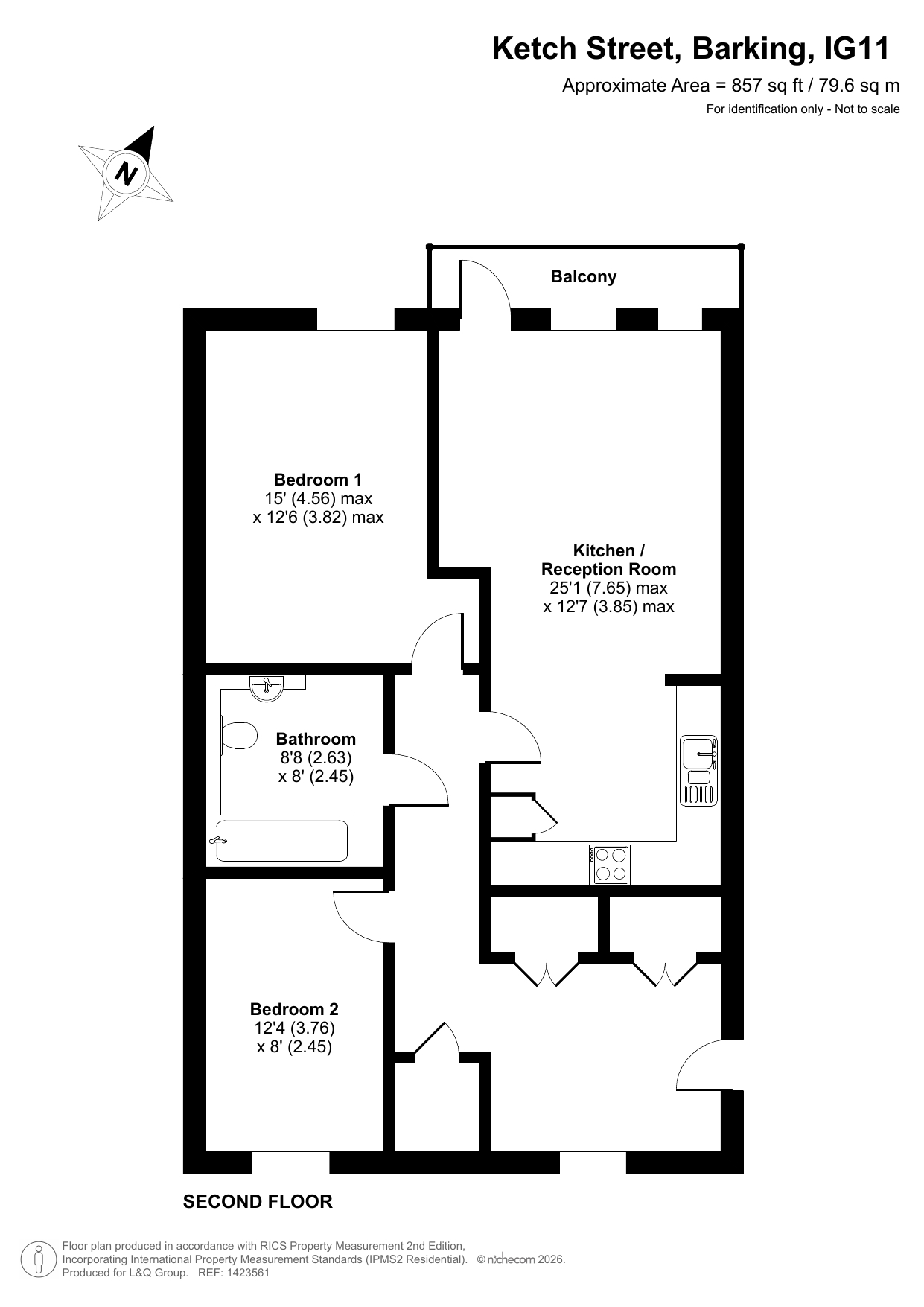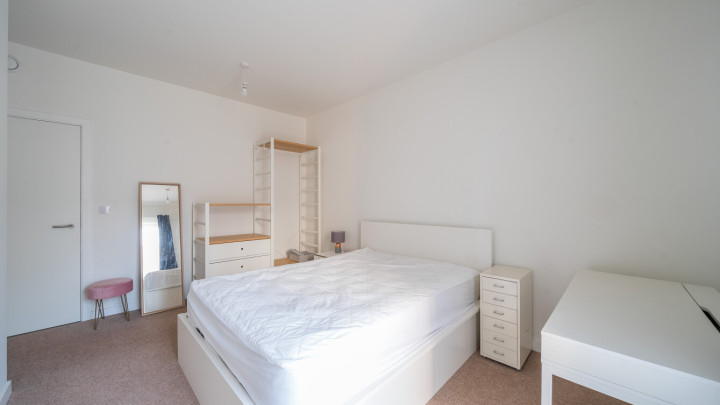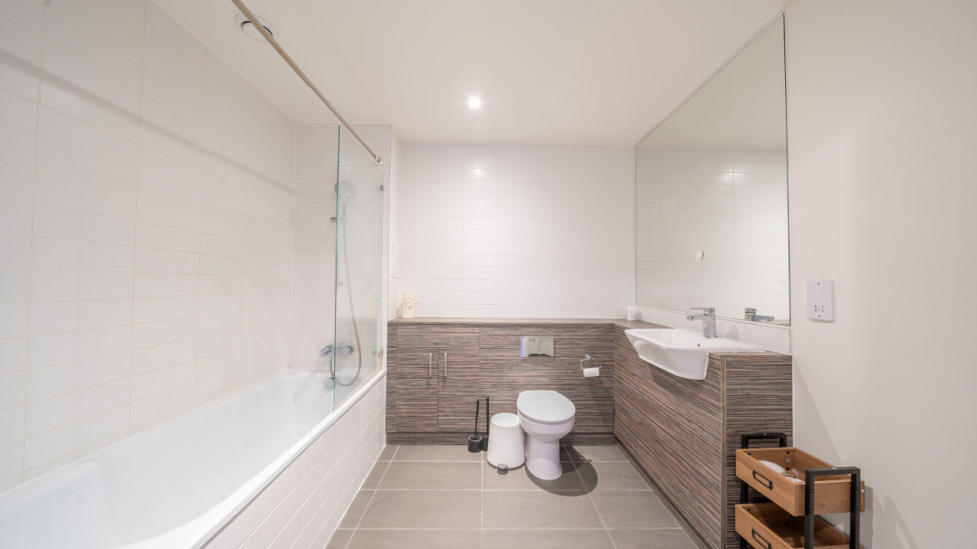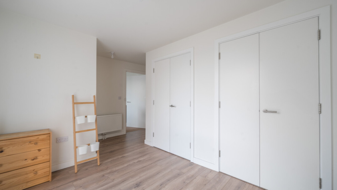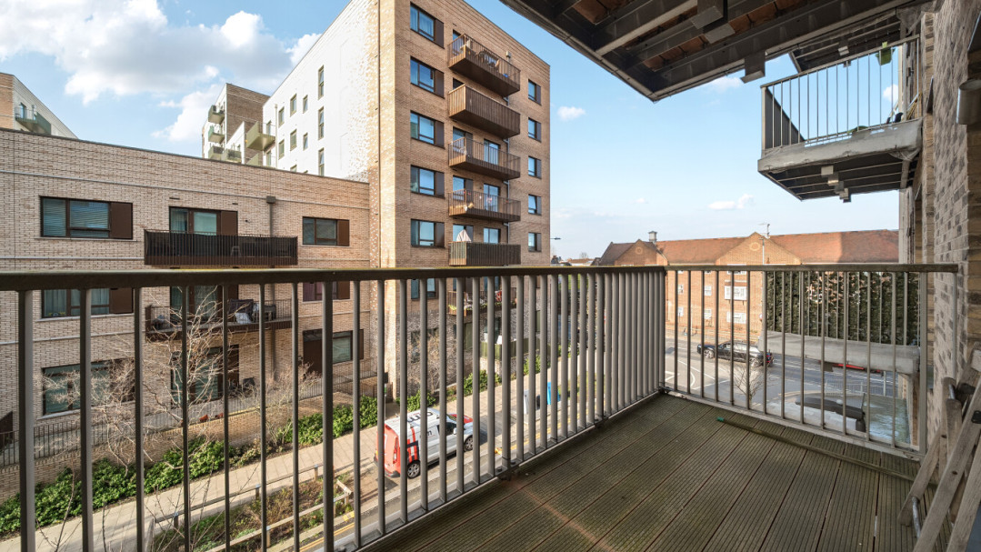 The hallway of this bright and spacious dual aspect two-bedroom apartment includes three large strorage cupboards. A stylish open plan living area, flooded with natural light from wide floor-length windows and door opens onto a private balcony. The kitchen, fitted with modern high gloss units finished with a wood effect worktop, benefits from integrated appliances including a fridge freezer, oven, hob and extractor fan. There are two well proportioned bedrooms and a contemporary bathroom complete with a white three-piece suite with a shower over bath and a tile surround.
