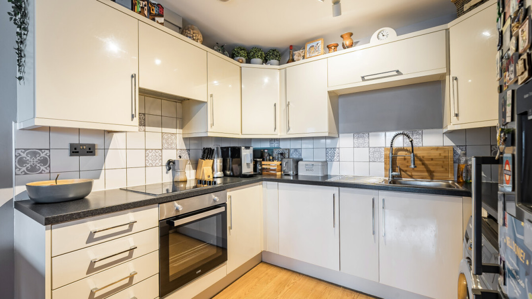 Enter this dual aspect apartment via your own front door accessed from the fourth floor deck and take a flight of stairs to the fifth floor, which is the top floor of the complex. the master bedroom is to your right at the top of the stairs and includes an in-built wardrobe with sliding doors. To your left pass the contemporary bathroom and the hallway leads to the seocnd bedroom/home office and the open plan kitchen/reception area, which has double doors opening onto a private balcony. The modern kitchen includes an intergrated (recently replaced) oven, hob and extractor and has spaces for a fridge freezer and washing machine. We understand that parking can be arranged in the multistorey car park for approximately £100 a montha and is accessed direct from the complex.