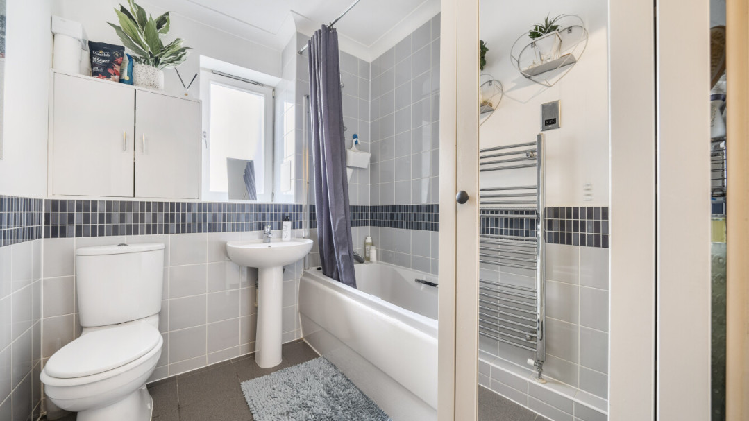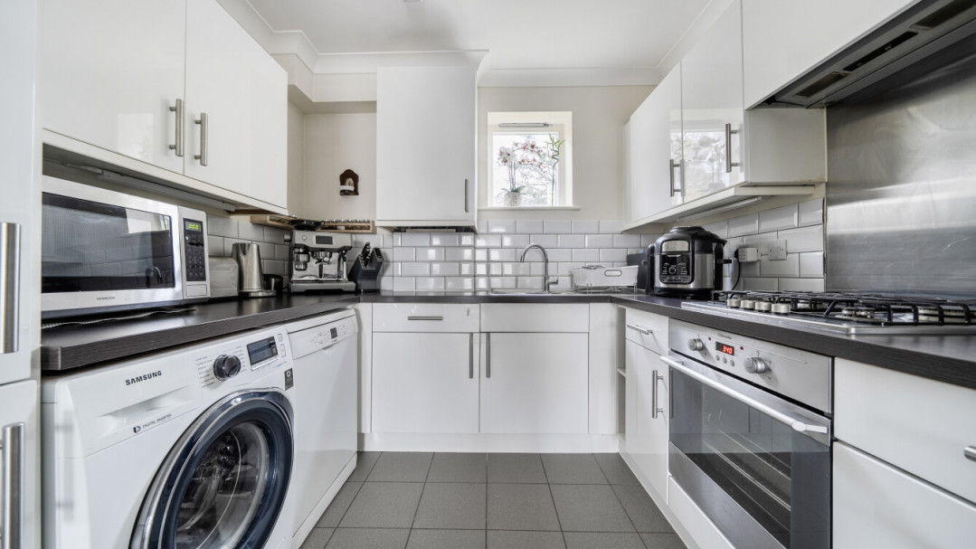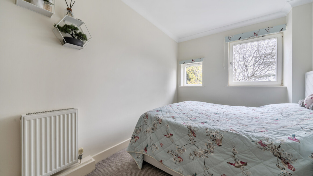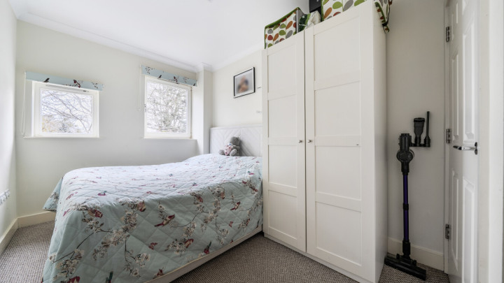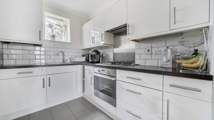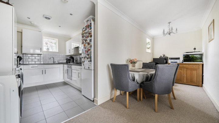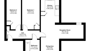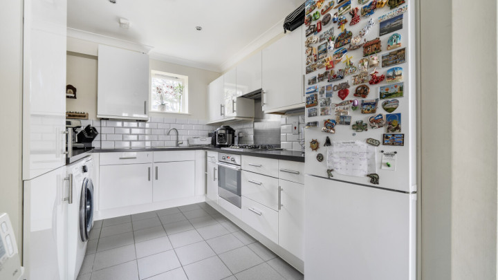 This bright, airy and spacious two bedroom first floor apartment consists of a large open plan reception room, which naturally divides into three separate areas to accommodate the kitchen, dining and lounge, as well as priving a nook for a home office. The modern kitchen is fitted with white wall and base units, and a black marble effect worktops. The kitchen also benefits from an integrated oven, hob and extractor fan. There are two double bedrooms, each with small in-built storage cupboards.