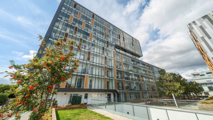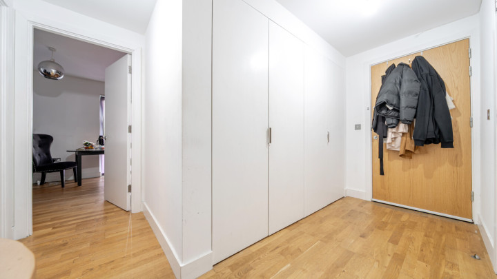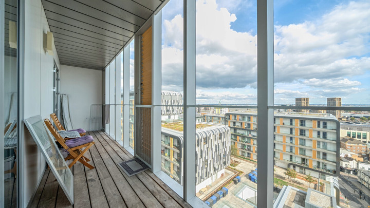 A large entrance hall, with storage, leads to an open plan living area with single large door opening onto to a good-sized covered balcony. The kitchen, fitted with high gloss wall and base units, includes integrated oven hob, extractor fan and fridge/freezer. The first bedroom, complete with fitted wardrobe, has a door onto the covered balcony. A second bedroom also has a door onto a covered balcony. A contemporary family bathroom completes the accommodation. The property has the benefit of fantastic views of the River Thames. Allocated parking.