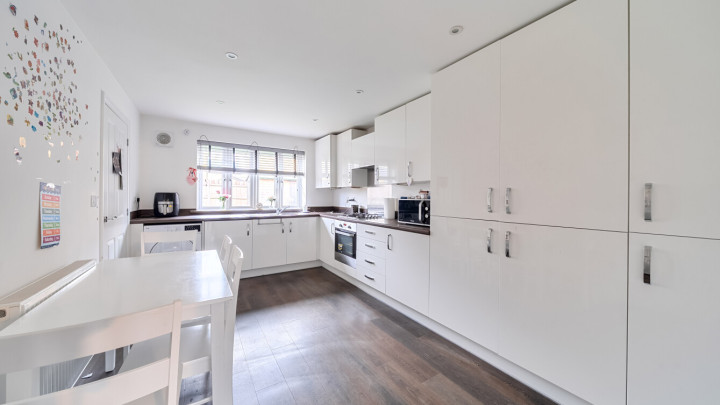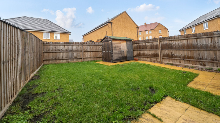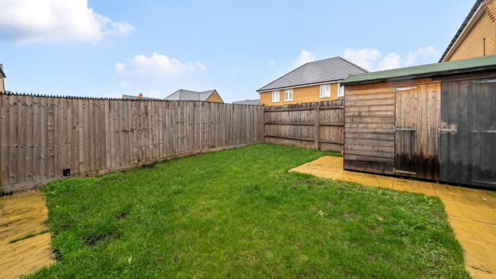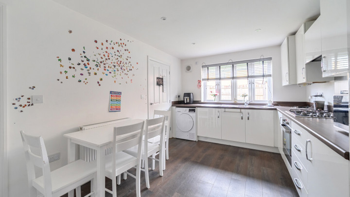Through the front door directly into the dual aspect sitting room, which overlooks the front garden. Through the sitting room, to the rear find a kitchen/dining room overlooking the rear garden and which is equipped with modern kitchen units with fully integrated appliances. There is a small porch to the rear of the house from which you can access the garden and a cloakroom/WC. A highlight is the enclosed rear garden, which is of a good size and is laid mainly with lawn, and a patio, it is complete with a useful shed, providing both outdoor leisure space and additional storage. The garden gives access via a gate to the driveway parking at the side of the house. The driveway offers two private parking spaces; the property ensures convenience for modern living.