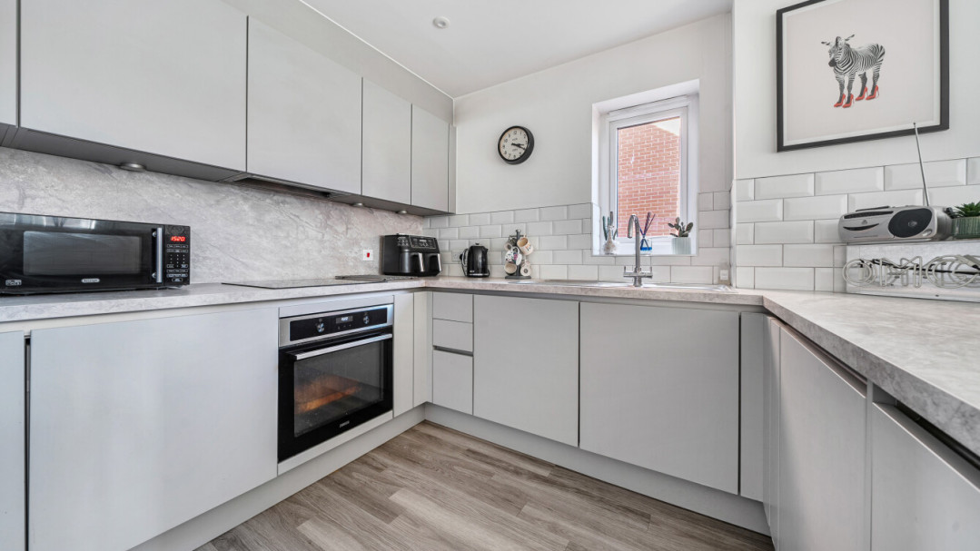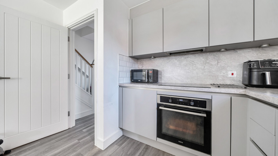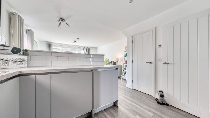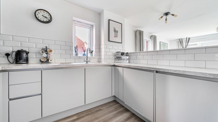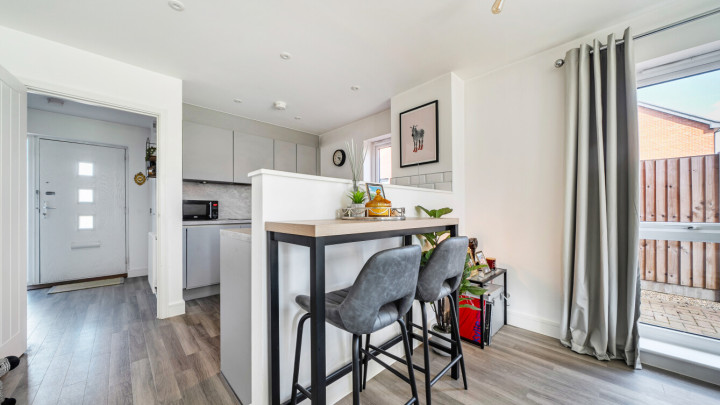 Welcome to this modern two bedroom end of terrace house. The property consists of a stylish open-plan kitchen and living area, flooded with natural light from wide floor-length windows, with french doors leading to back garden. The kitchen is fitted with beautiful wall and base units, and a grey marble effect worktop. The kitchen also benefits from integrated appliances including a oven, hob, extractor fan.There is also the benefit of breakfast bar. There is also a seaprate wc. There are two double bedrooms, one benefitting with built-in storage cupboards. One of the double bedrooms has floor-length windows. The bathroom comes complete with a white three-piece suite with a shower over bath and modern beige tile surround. Additional double storage cupboards in hallway. The whole property is beautifully presented.