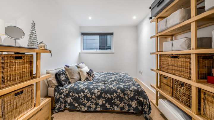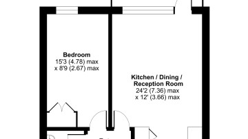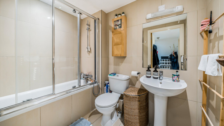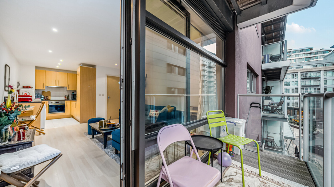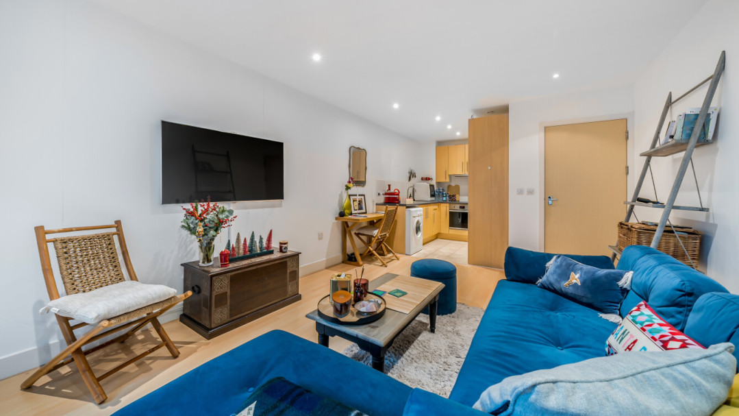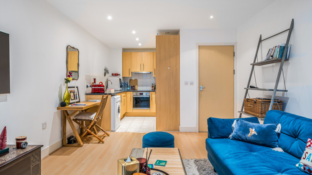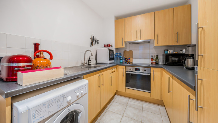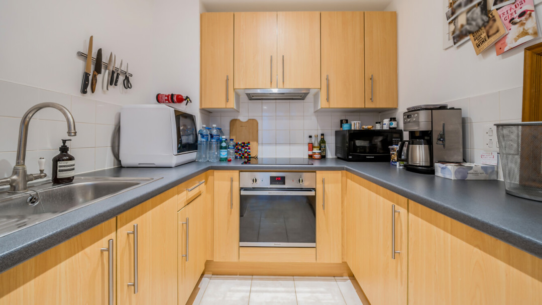 This bright west facing apartment consists of an open-plan kitchen and living area, flooded with natural light from wide floor-length windows opening onto a private balcony overlooking the communal gardens. The kitchen is fitted with Beech wall and white base units, and a grey granite effect worktop and includes an integrated fridge/freezer, oven, hob, and extractor fan. There is a spacious double bedroom including a fitted wardrobe and the bathroom comes complete with a white three-piece suite with a shower over bath and a tile surround.